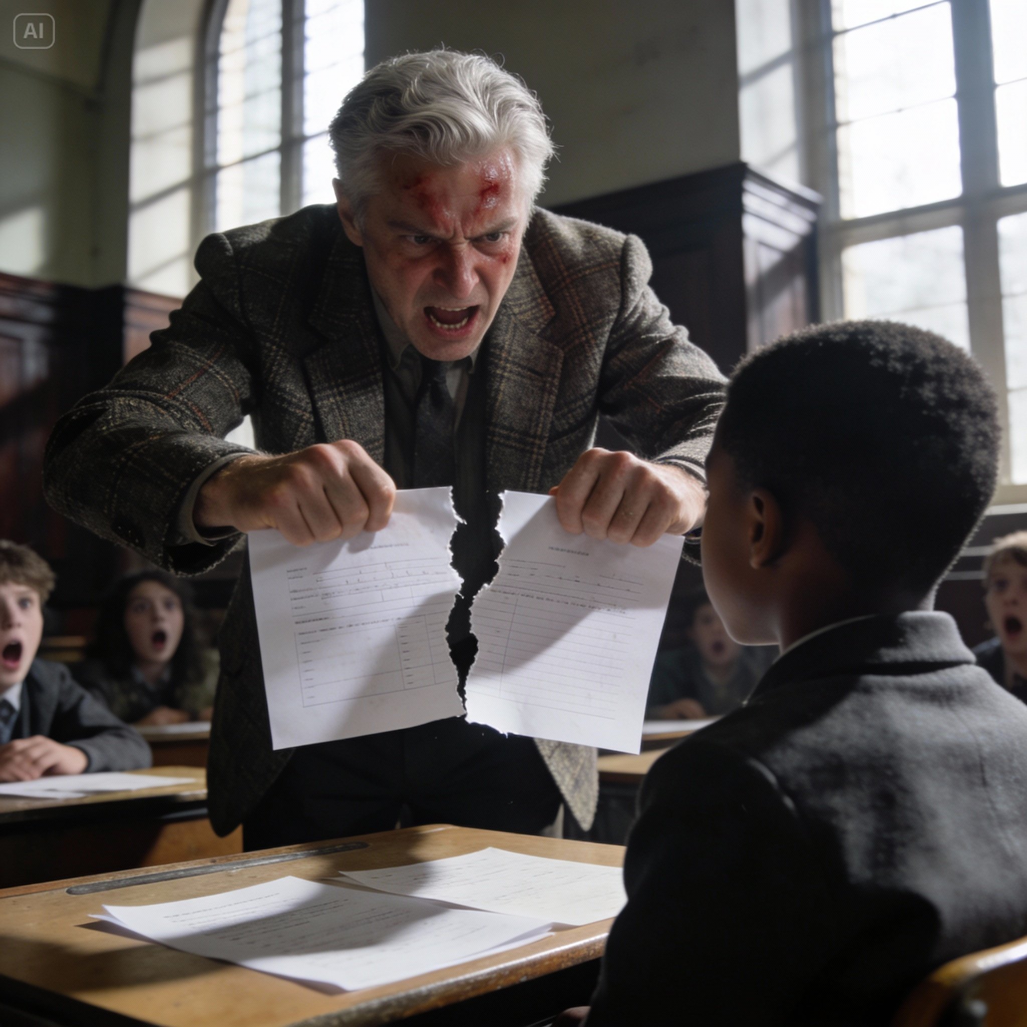“Enough,” Mr. Harrison said coldly. He held the exam paper in both hands. And then, with deliberate, methodical cruelty, he began to tear it.