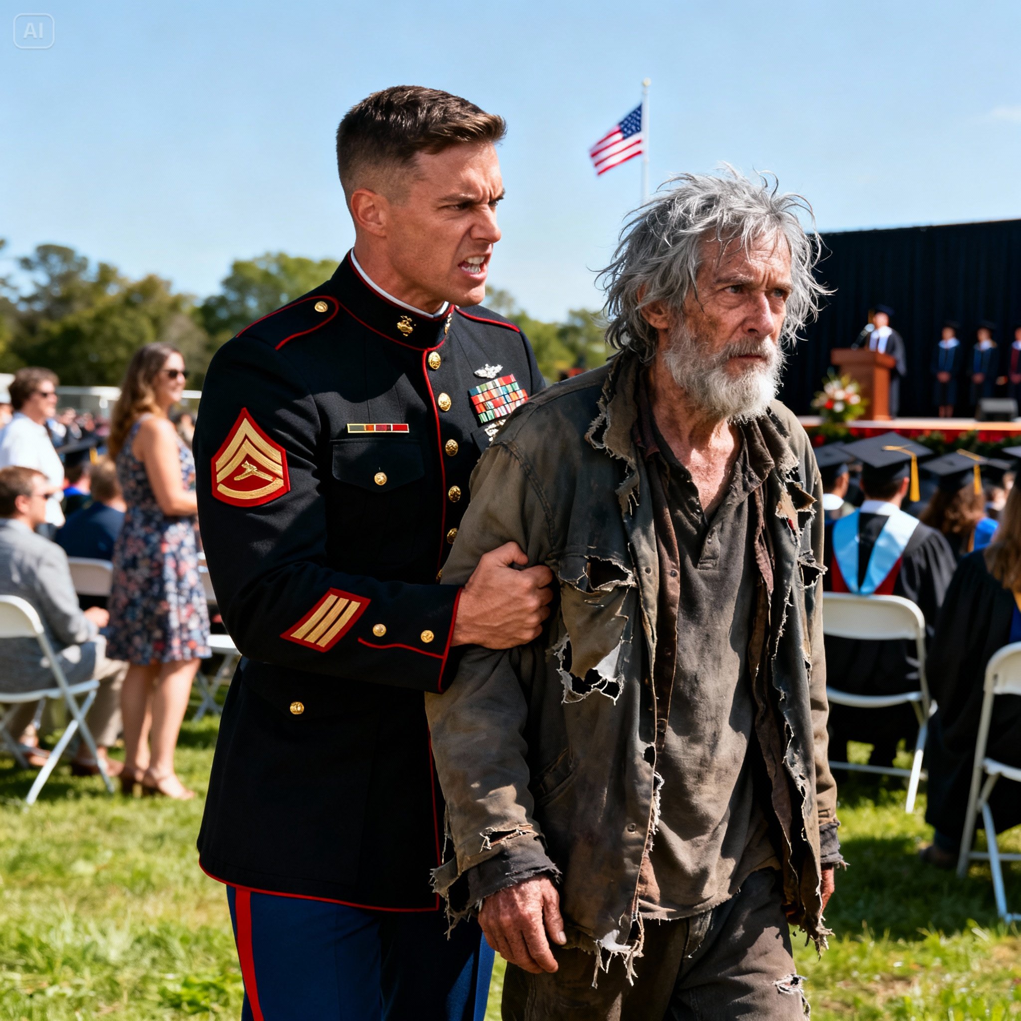 The homeless man said nothing. His gaze remained fixed, locked on a distant stage where two young women in caps and gowns stood side-by-side, their faces turned toward a speaker, blissfully unaware. The world had shrunk to that single point of light for him—the sight of them. Everything else, the noise, the crowd, the hand digging into his arm, was just static.