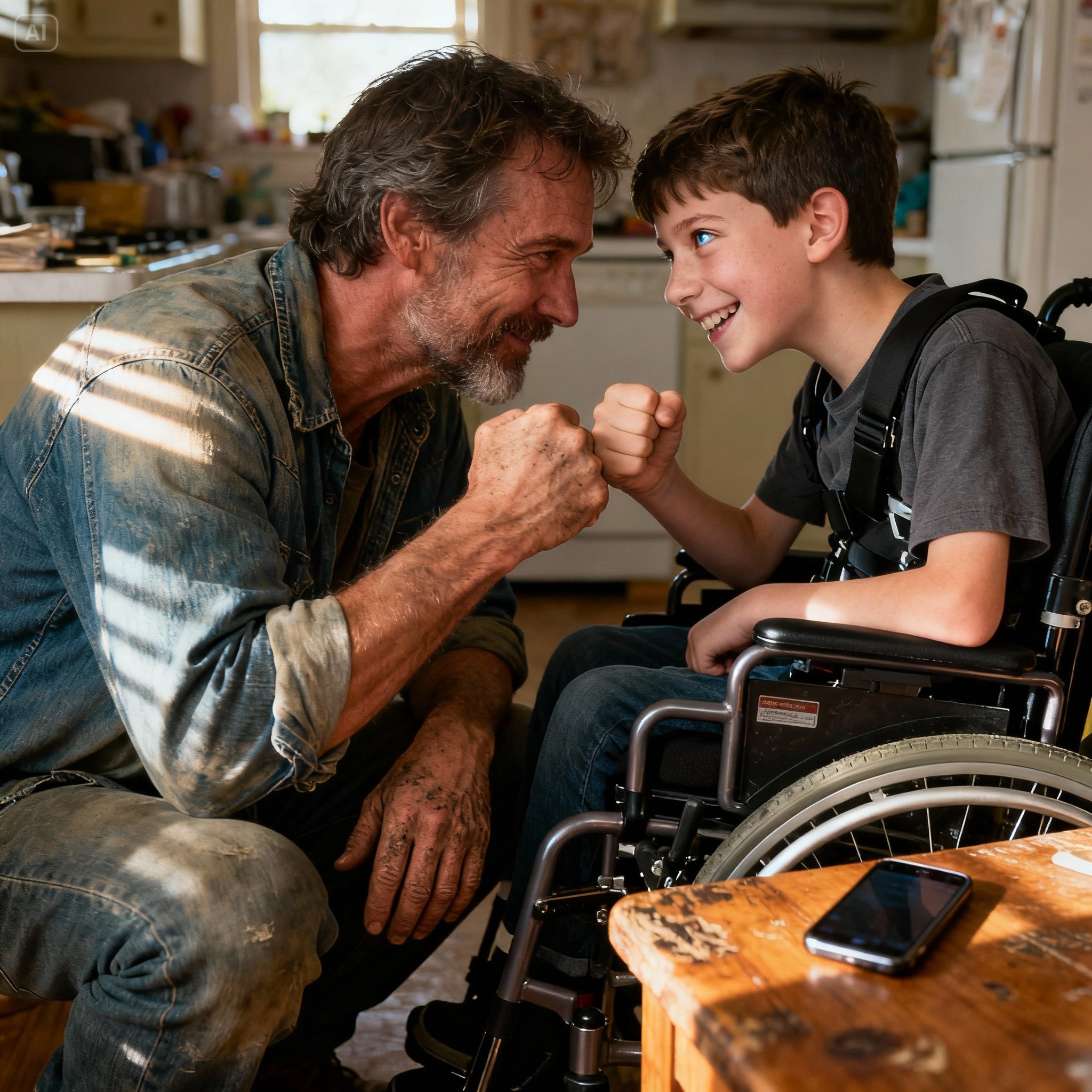 Sarah watched them from the stove, her own heart full to the point of aching. The two most important men in her life. One bound to wheels by a twist of fate, the other by a conscious choice. For a second, the sizzle of the bacon faded, the hum of the refrigerator went silent, and there was only the sight of them, a perfect, unassailable circle of love.