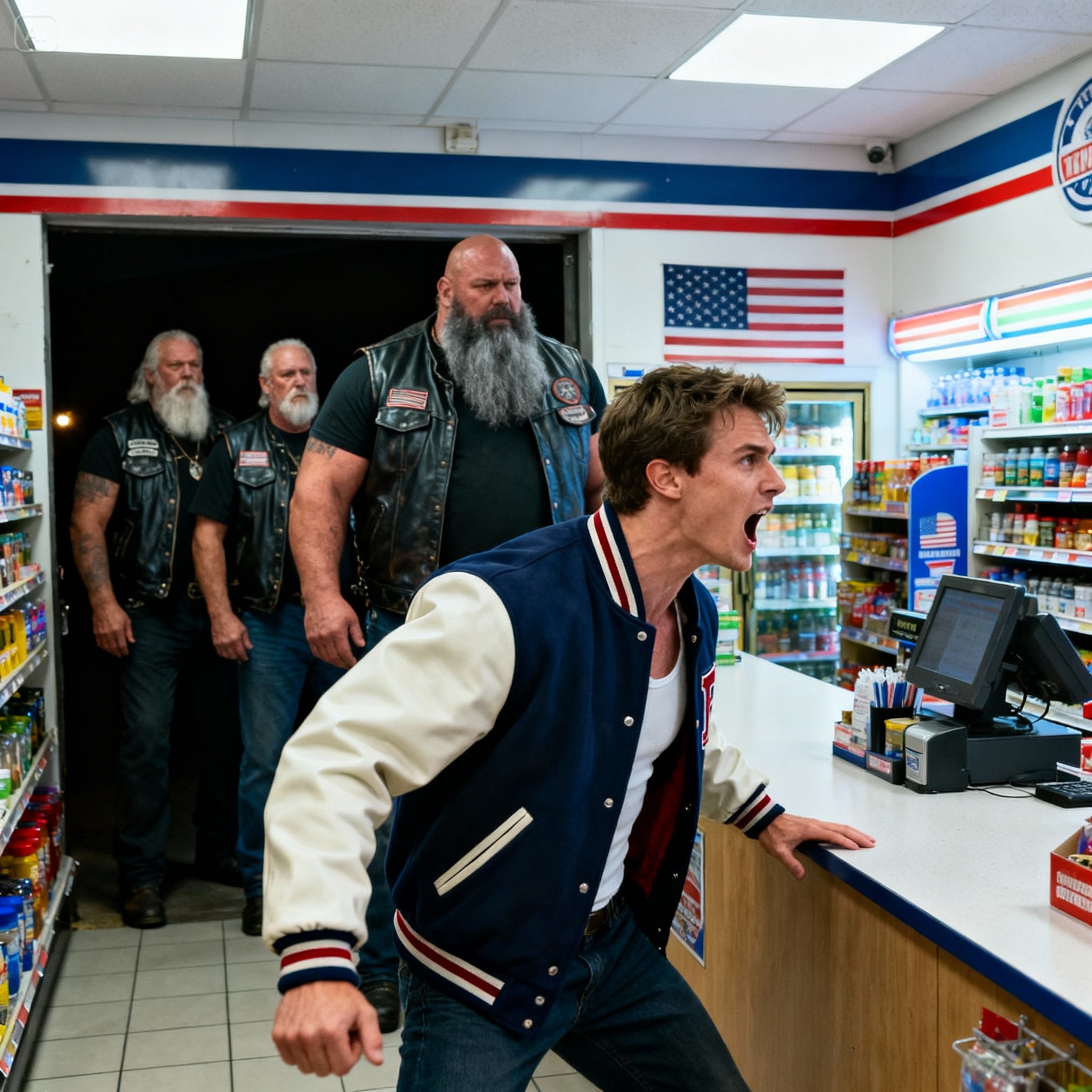 The bikers moved with the silent, terrifying coordination of a wolfpack. They didn’t speak. They just moved, forming a circle. A tight, impenetrable ring of red and white surrounded the front counter, trapping Warner, Trent, and Bryce in a claustrophobic pit of their own making.