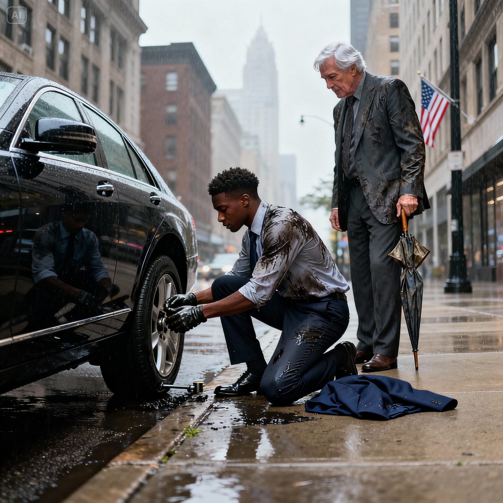 It was parked just off the main avenue, half-pulled onto the shoulder. A sleek, black sedan, the kind of car that whispered of money and power, its paint job so deep it seemed to drink the gray light. The back tire was grotesquely flat, slumped against the wet pavement like a broken bone. The trunk was open, a spare tire half-dragged onto the asphalt. And beside it, an old man was losing a battle against the storm.