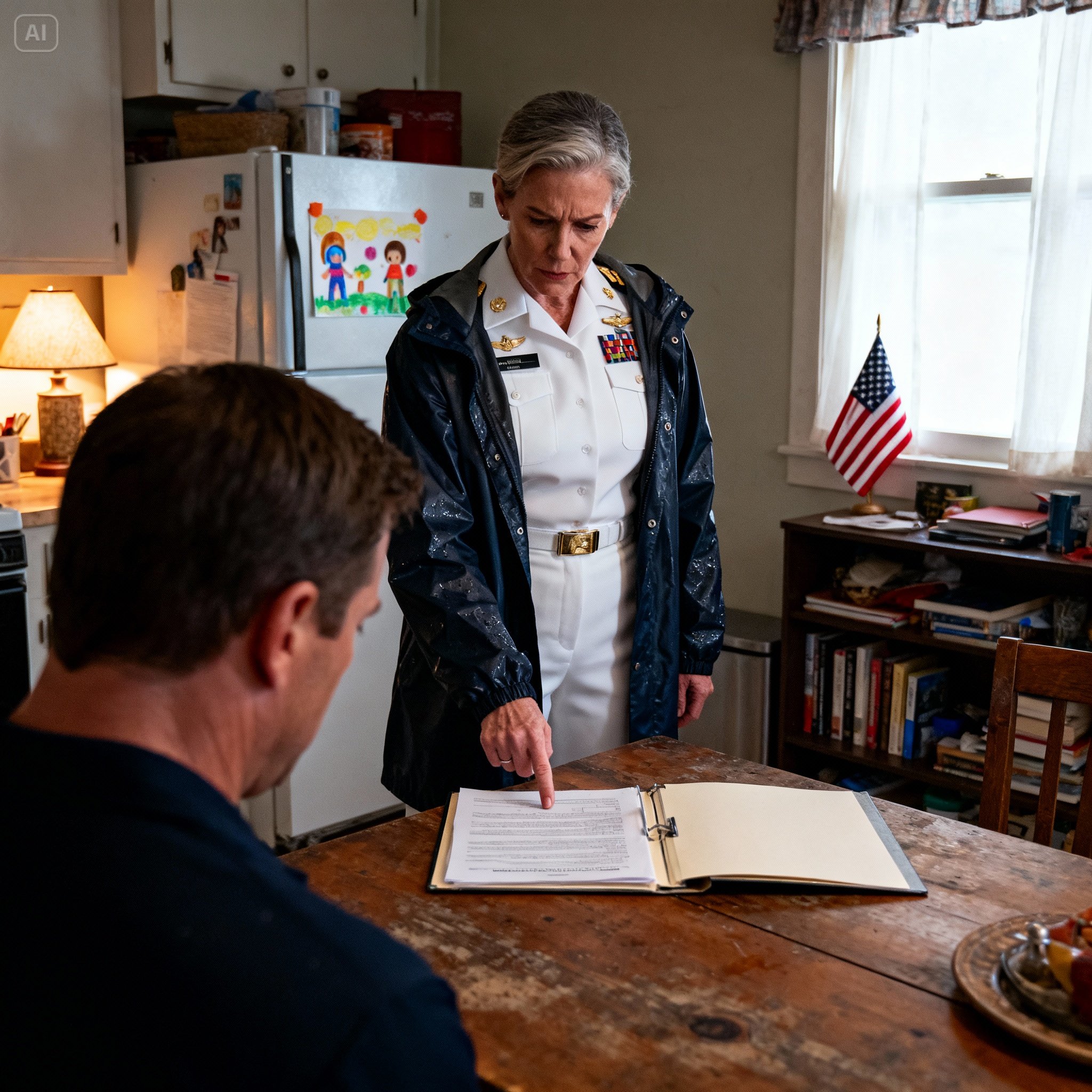 The woman was wearing a white Navy dress uniform. The fabric was so saturated it clung to her frame, the crisp lines of a military career dissolved into something fragile and human. Her shoulders were slumped with a weariness that went deeper than muscle. One hand was pressed to her forehead, as if she were trying to physically hold a thought in place, or maybe hold back a wave of pain. A single, dark suitcase dangled from her other hand, its corner scraping against the wet pavement with a faint, rhythmic hiss that was barely audible over the storm.
