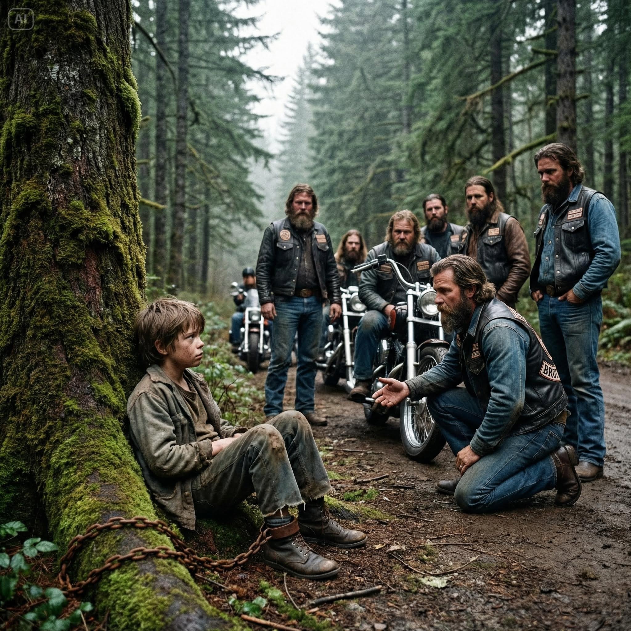 Rev cut his engine, his heavy leather boots hitting the wet asphalt with a finality that signaled the end of someone’s world. The others followed, moving like ghosts through the mist, their high-powered flashlights sweeping the base of the trees.