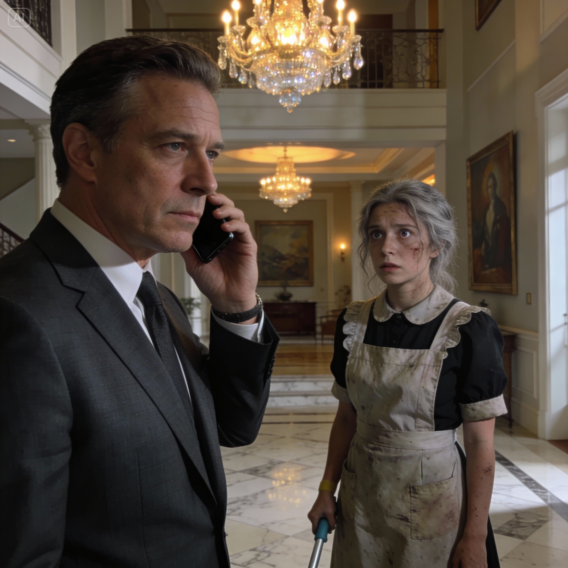 In the foyer, a woman in a gray uniform was on her knees, scrubbing the marble near the stairs. Her back was bent, hair pulled into a loose knot, shoulders tight. A bucket of cloudy water sat beside her.