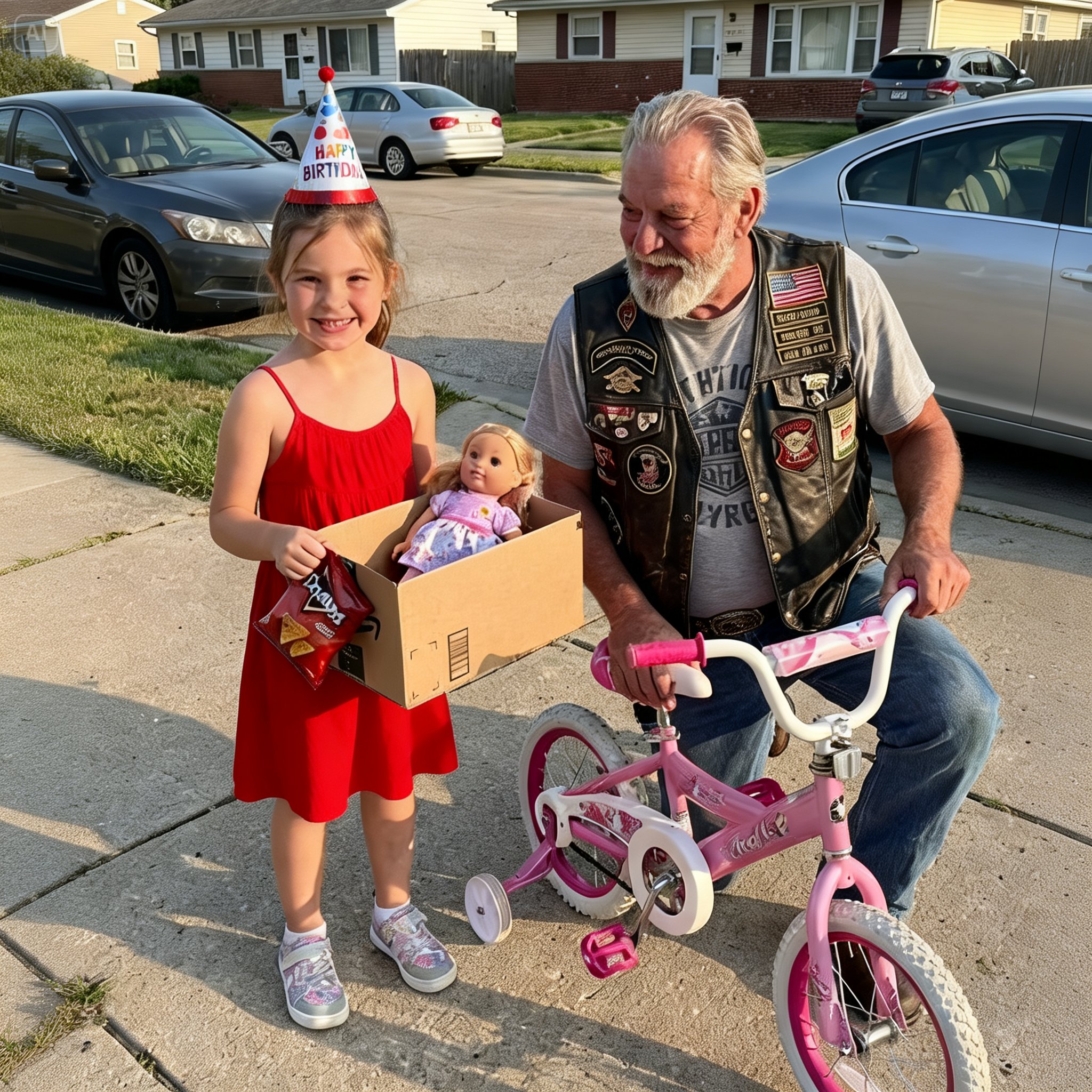 They didn’t just bring a bike. They opened their saddlebags. Out came Barbies, coloring books, a new backpack for school, boxes of pizza, and a cake that said Happy 6th Birthday Lily.