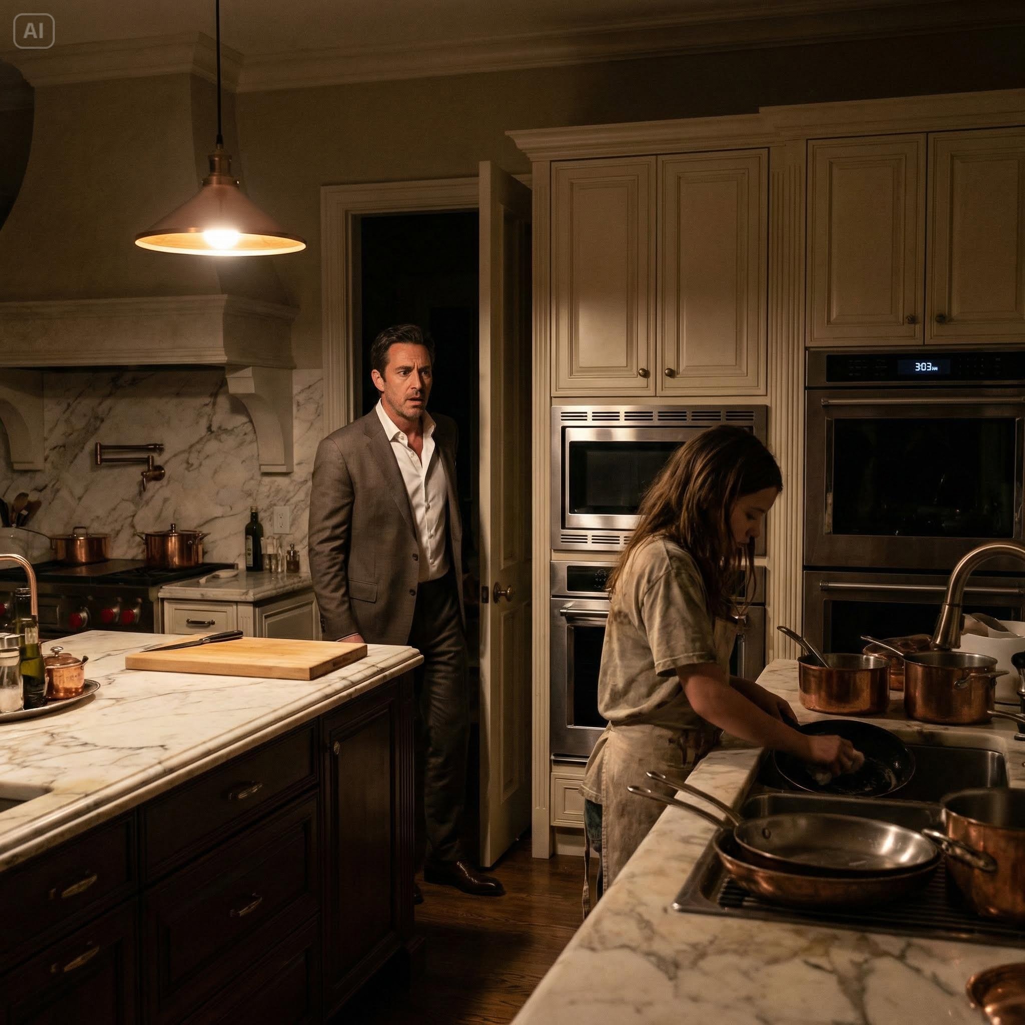 He listened. The sound came from the ground floor at the far end of the house. From the main kitchen, the quiet rhythmic friction of a sponge on a plate. He moved down the hall, his leather slippers silent on the plush runners. He descended the staircase, his mind racing. It was not a thief. A thief would not be washing dishes.