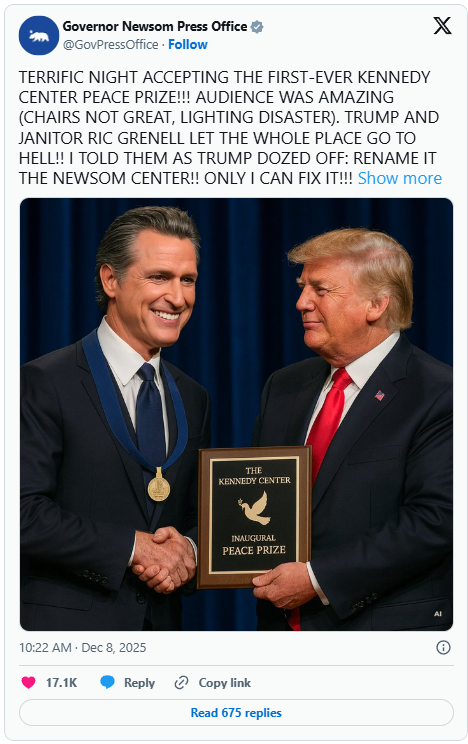 Governor Newsom, who has transformed his press office’s social media feed into a platform for ruthless parodies of the administration’s most eccentric moments, recognized the immediate vulnerability of the situation. The “peace prize” was a soft target, tailor-made for public mockery.