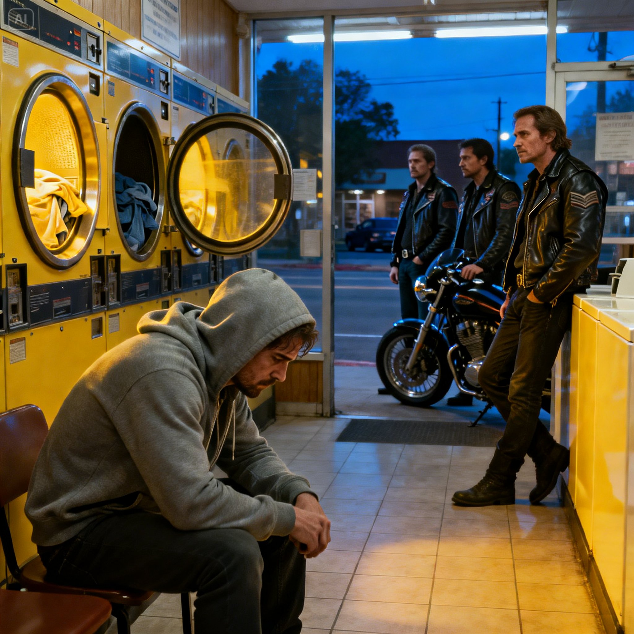 “Maybe he likes watching clothes spin,” Jax joked, though his eyes narrowed. “Or maybe he’s waiting for his mom.”