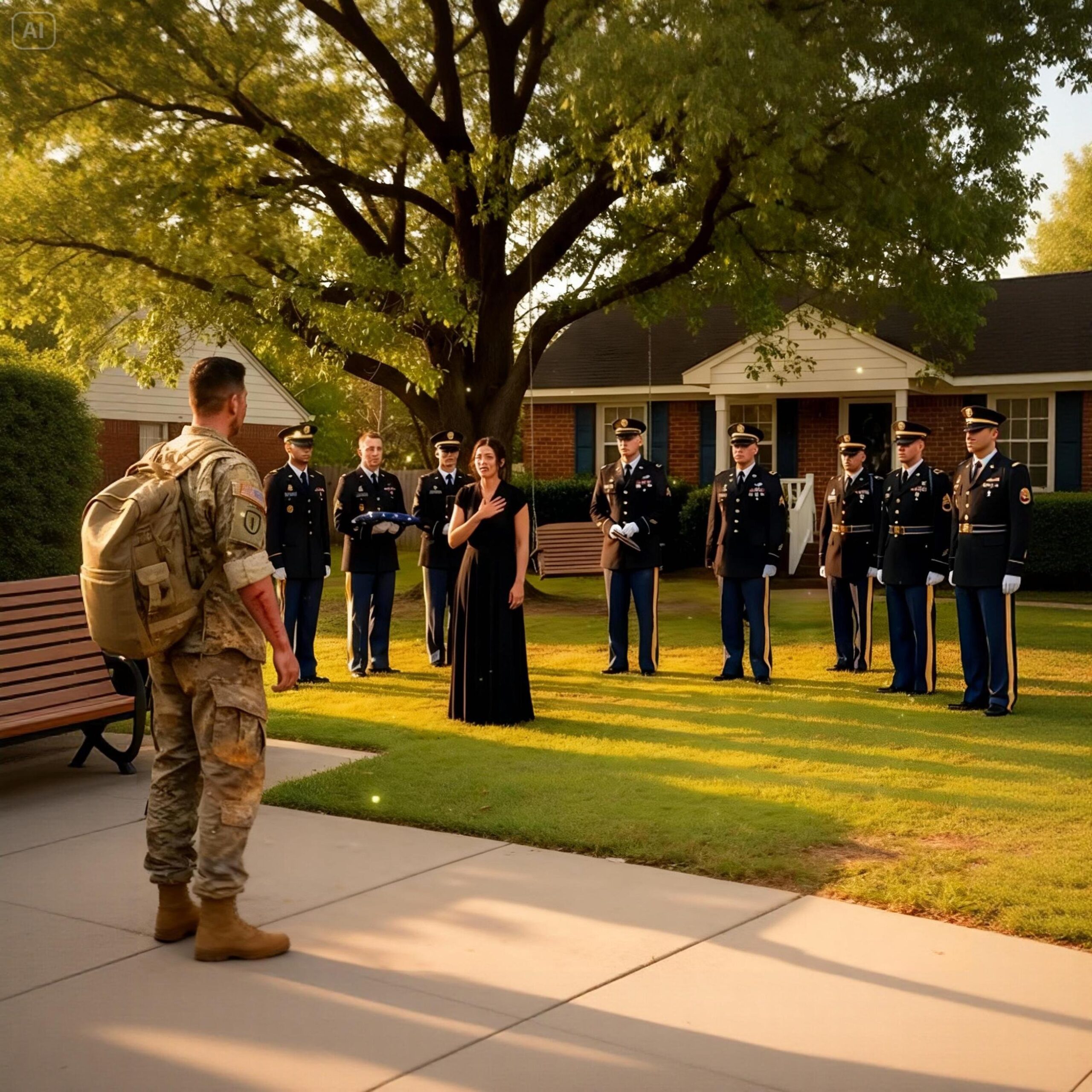 Ten soldiers in full dress blues stood in a rigid semicircle on his front lawn. Their postures were stiff, formal, iconic. The gold braid on their uniforms caught the sunlight. Two of them held folded American flags, the triangles tight and perfect. An officer stood slightly apart, his hand resting on the hilt of a ceremonial sword.