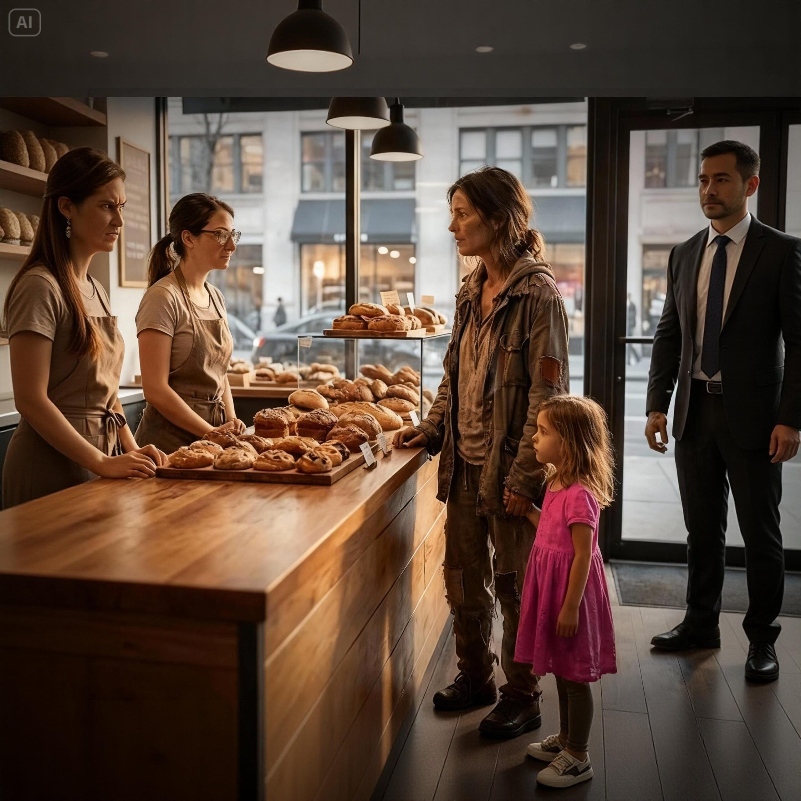 “Ma’am, look. I get people like you in here every week. ‘Just a bagel.’ ‘Just a crust.’ If I give you something, ten more of you will show up tomorrow. It’s store policy. No handouts. Now please, you’re disturbing the customers.”