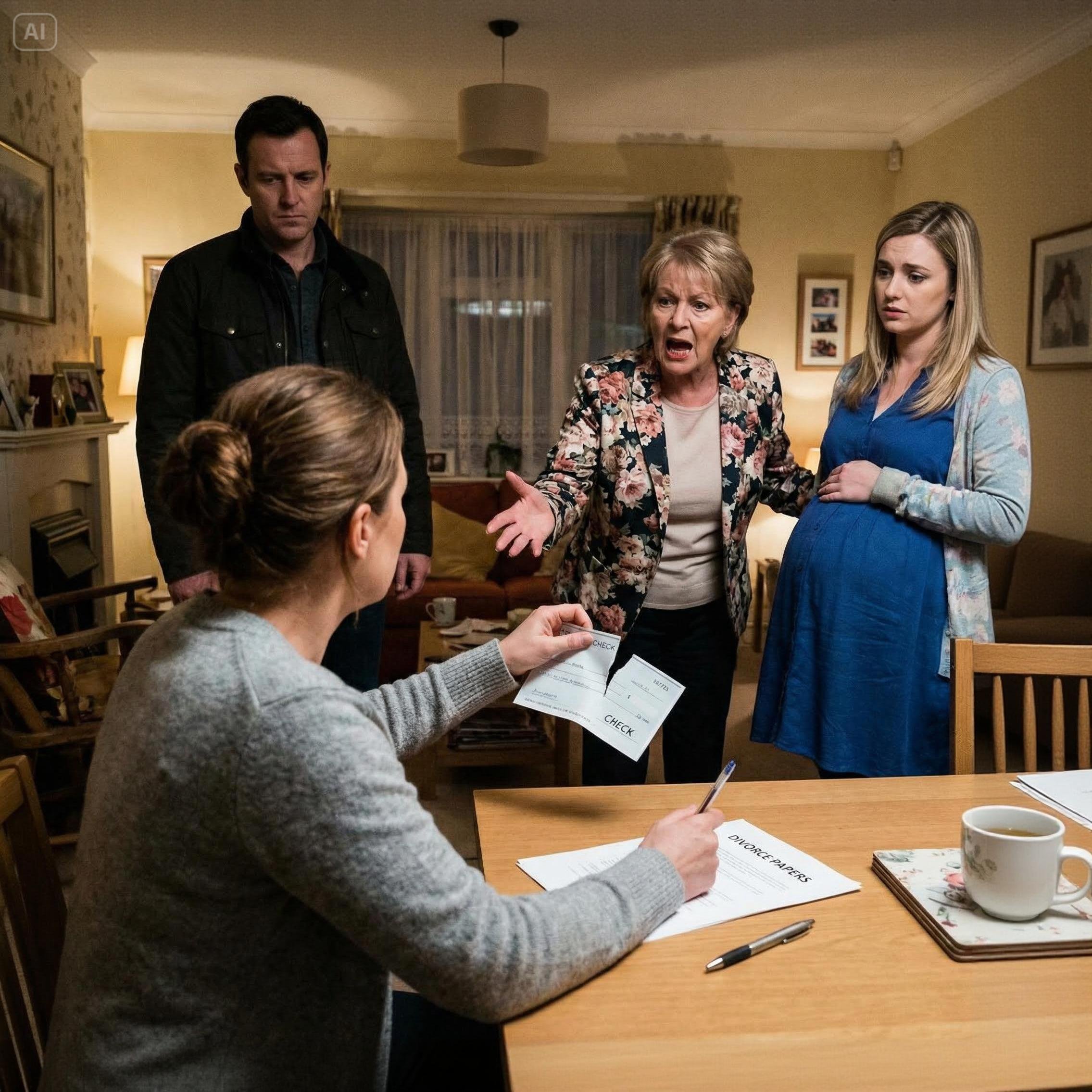 My mother-in-law came with my husband’s pregnant mistress, and shouted loudly “Take $175k, leave. We don’t need a barren woman!” My husband stood silent. I tore up the check and signed the divorce papers. Nobody knew, but i was pregnant too…