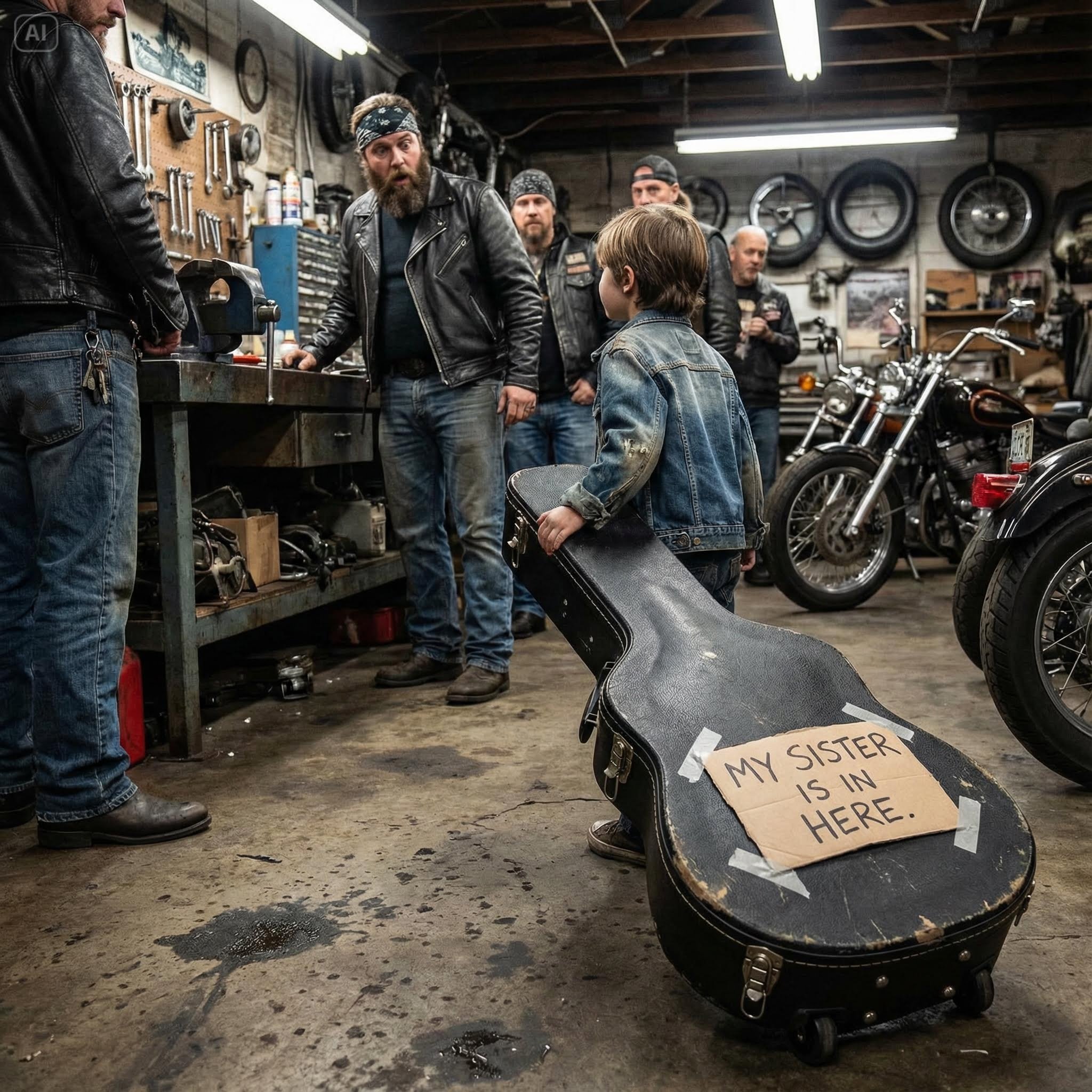 Five massive bikers had stopped their work. Knuckles had flipped up his mask. Gearbox had slid out from under the bike. The shop was dead silent.
