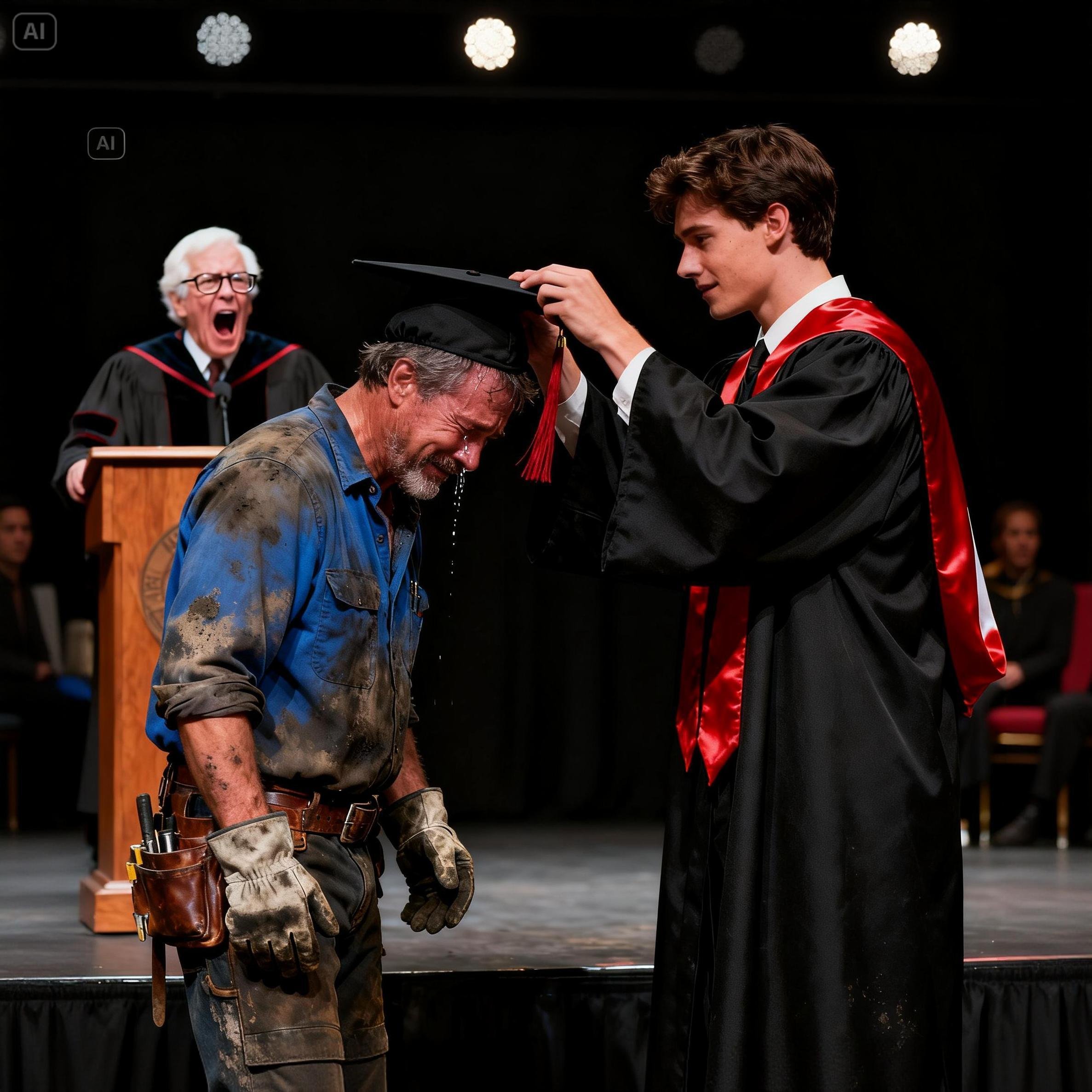 He didn’t shake his hand; he bowed slightly. Then, the entire room—professors, students, my few relatives—erupted into a sustained, thunderous applause, not for the new PhD, but for the construction worker in the back.