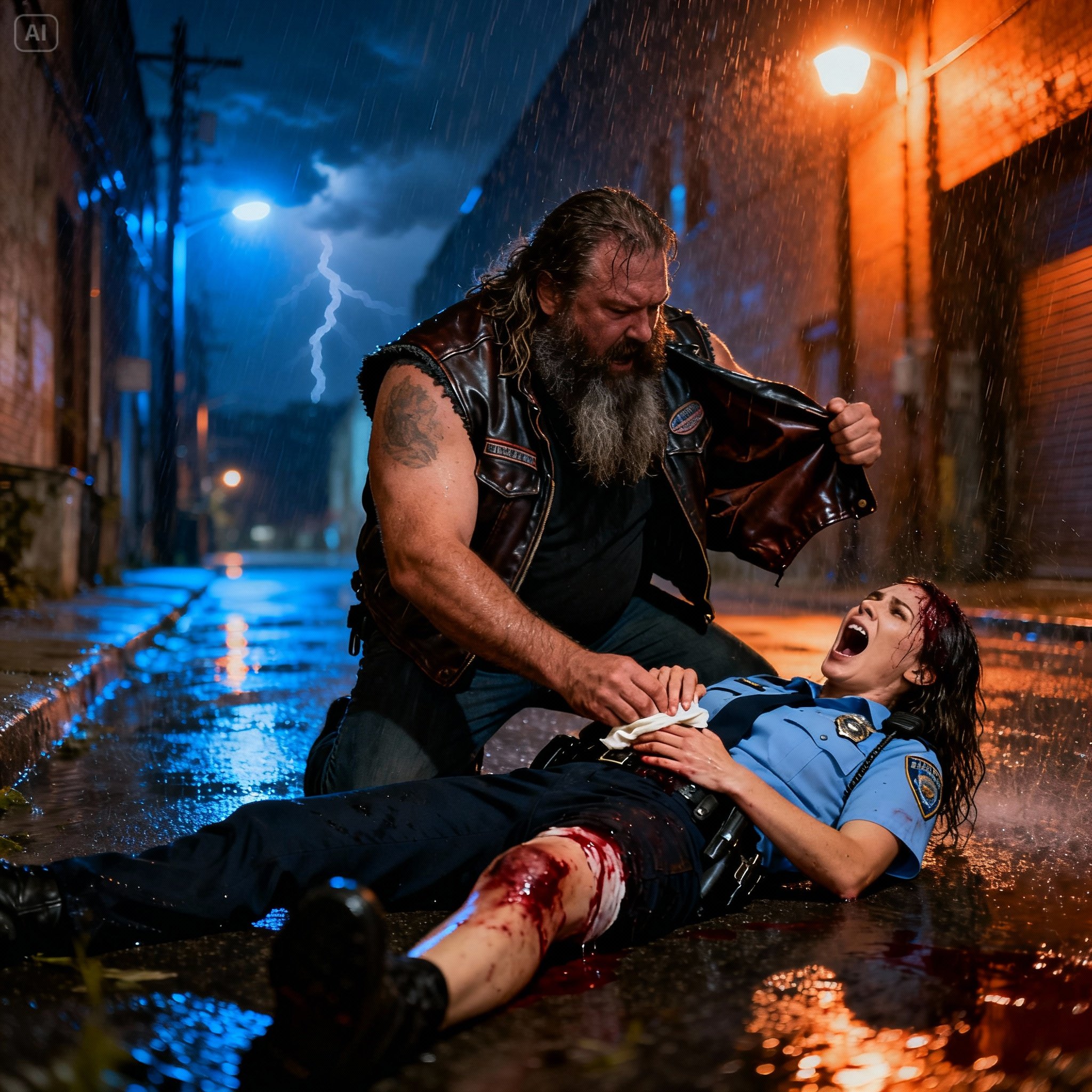 Without a second of hesitation, Nathan unzipped the vest. He peeled it off, the heavy leather warm from his body. He folded it, ignoring the patches he had bled for, and pressed the inside lining—the clean part—hard against her thigh.