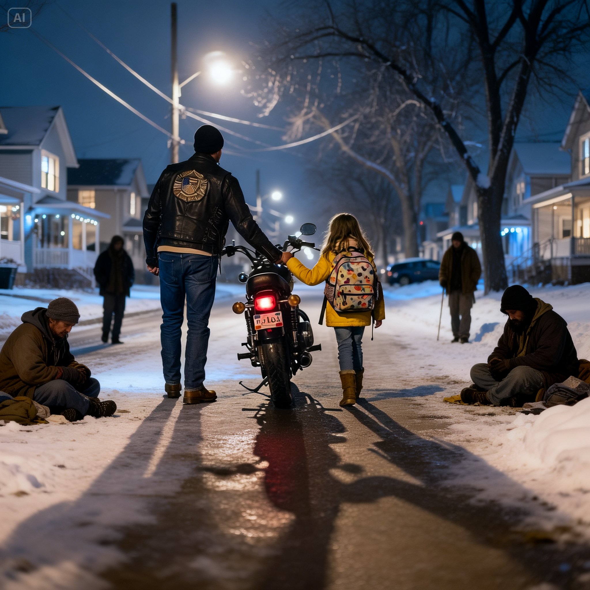 A little girl—maybe seven—stood beside his motorcycle, backpack too big for her shoulders, shoes scuffed from walking. They were wide, dark pools of absolute terror. She wasn’t crying. She was vibrating. A fine tremor that shook her small frame from the inside out.