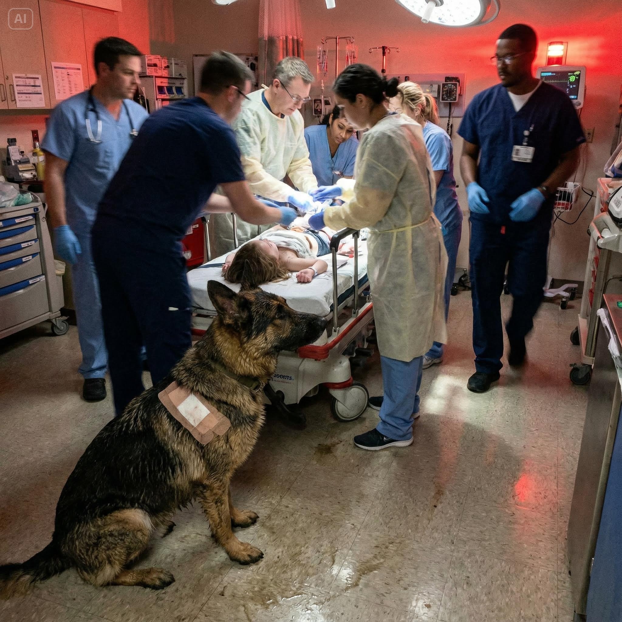 As we lifted her onto the gurney, the dog forced himself upright. It was impossible. I saw his back legs give out, but he scrambled, claws scrabbling on the tile, dragging himself up by sheer will. He wouldn’t let the gurney leave his sight. He pressed his flank against the metal railing, limping heavily, keeping pace as we ran toward the trauma bay.