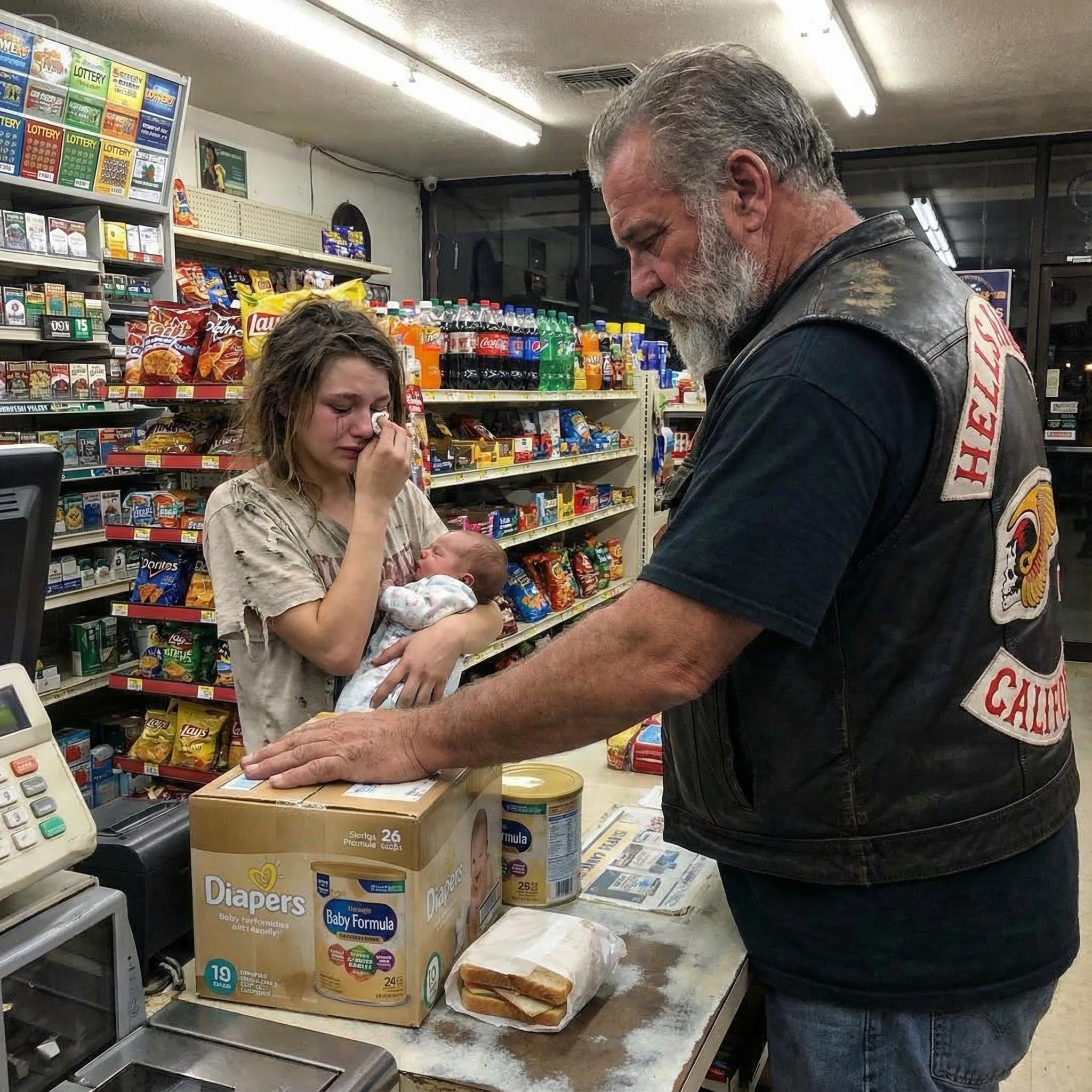 Maya ran. She grabbed the diapers, the food, the water. She came back to the counter, sobbing openly now. The clerk rang it all up in record time, his hands shaking. The biker told him to keep the change.