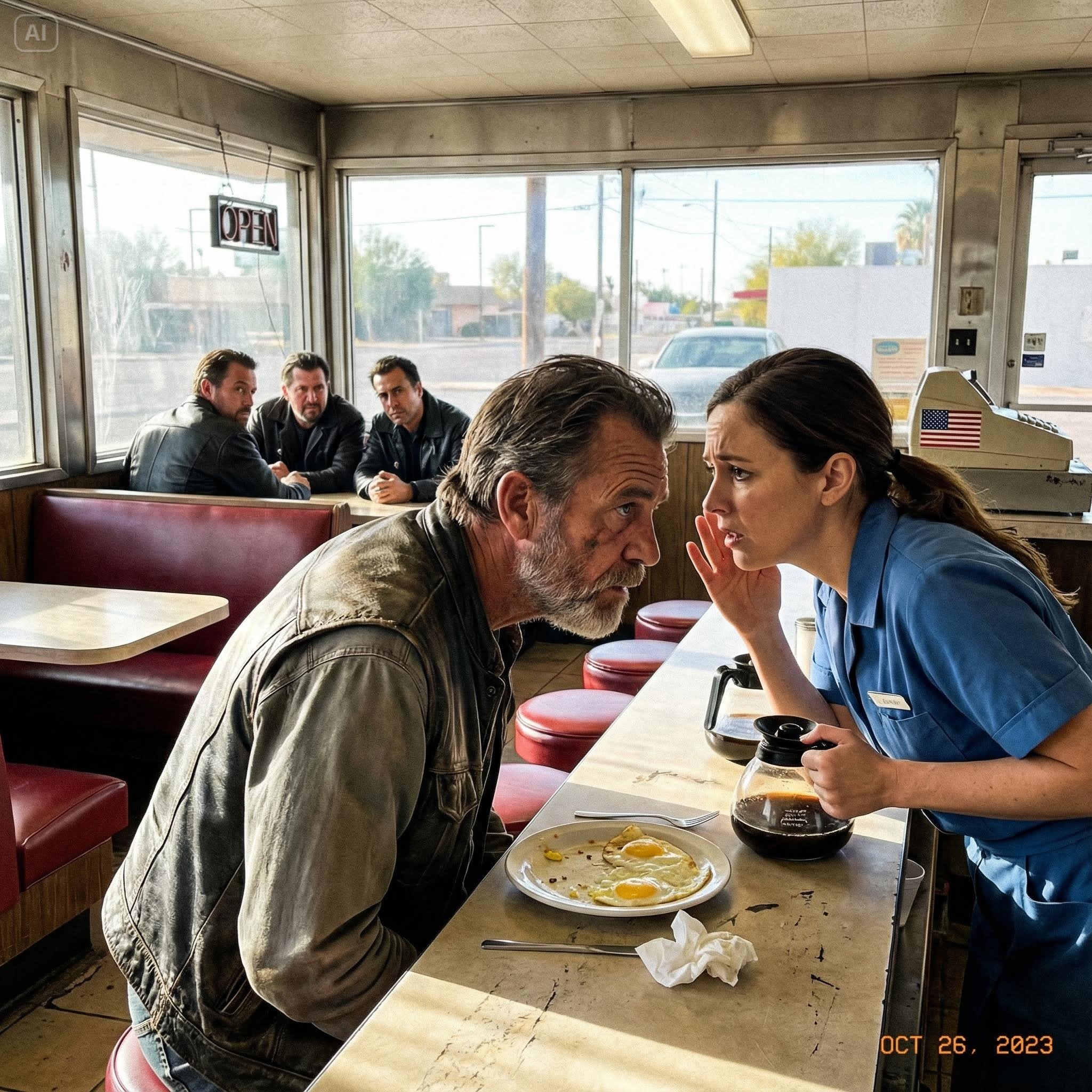I leaned over the counter, pretending to wipe a spill. I got so close I could smell the leather and tobacco on his jacket. My lips barely moved.