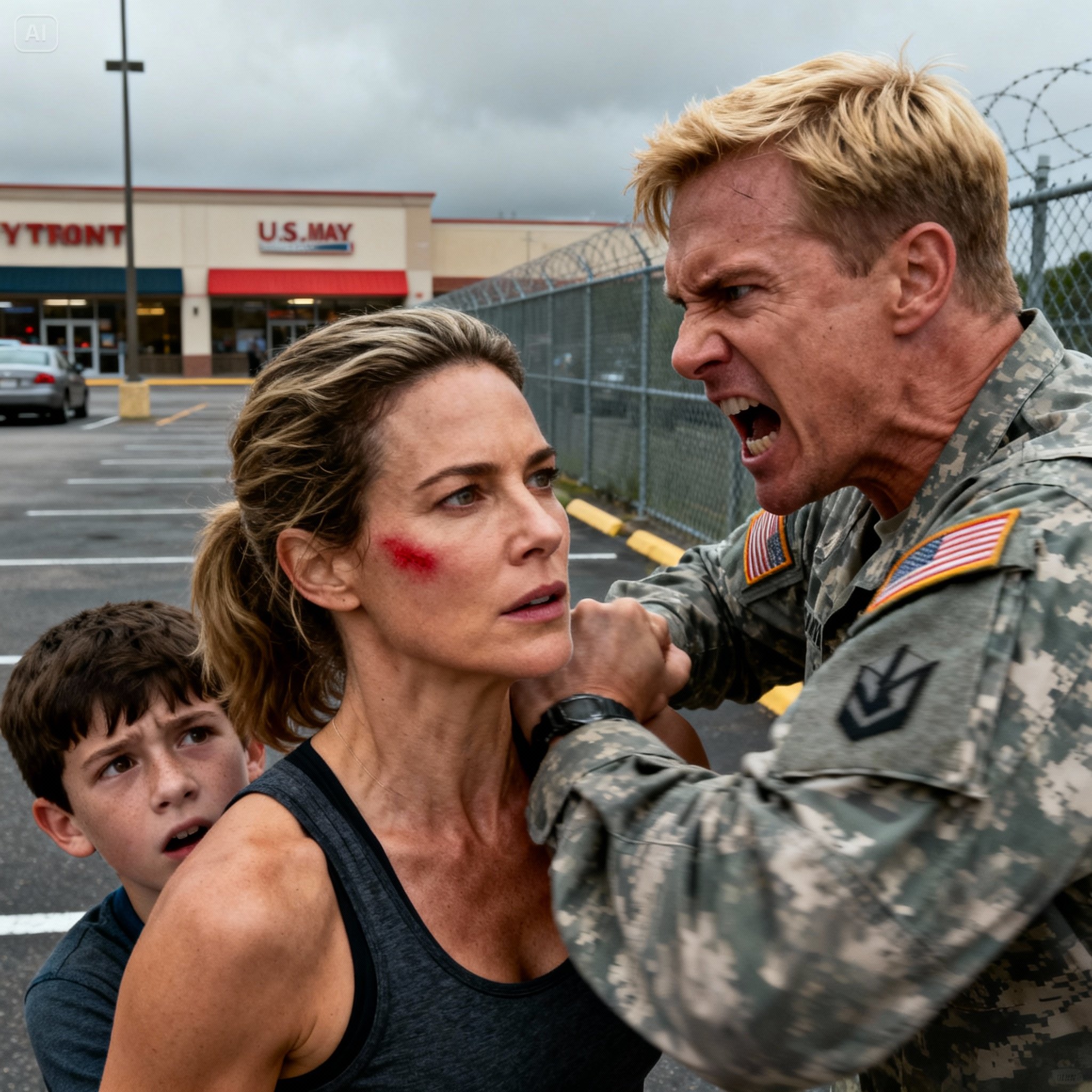 Jake just saw the motion first. The soldier’s hand, cutting the air fast, brutal, and perfectly committed. Then came the sharp, ugly smack across his mother’s face. The silence that followed was deafening, the sound of a bomb dropped in the middle of a mundane strip mall parking lot.