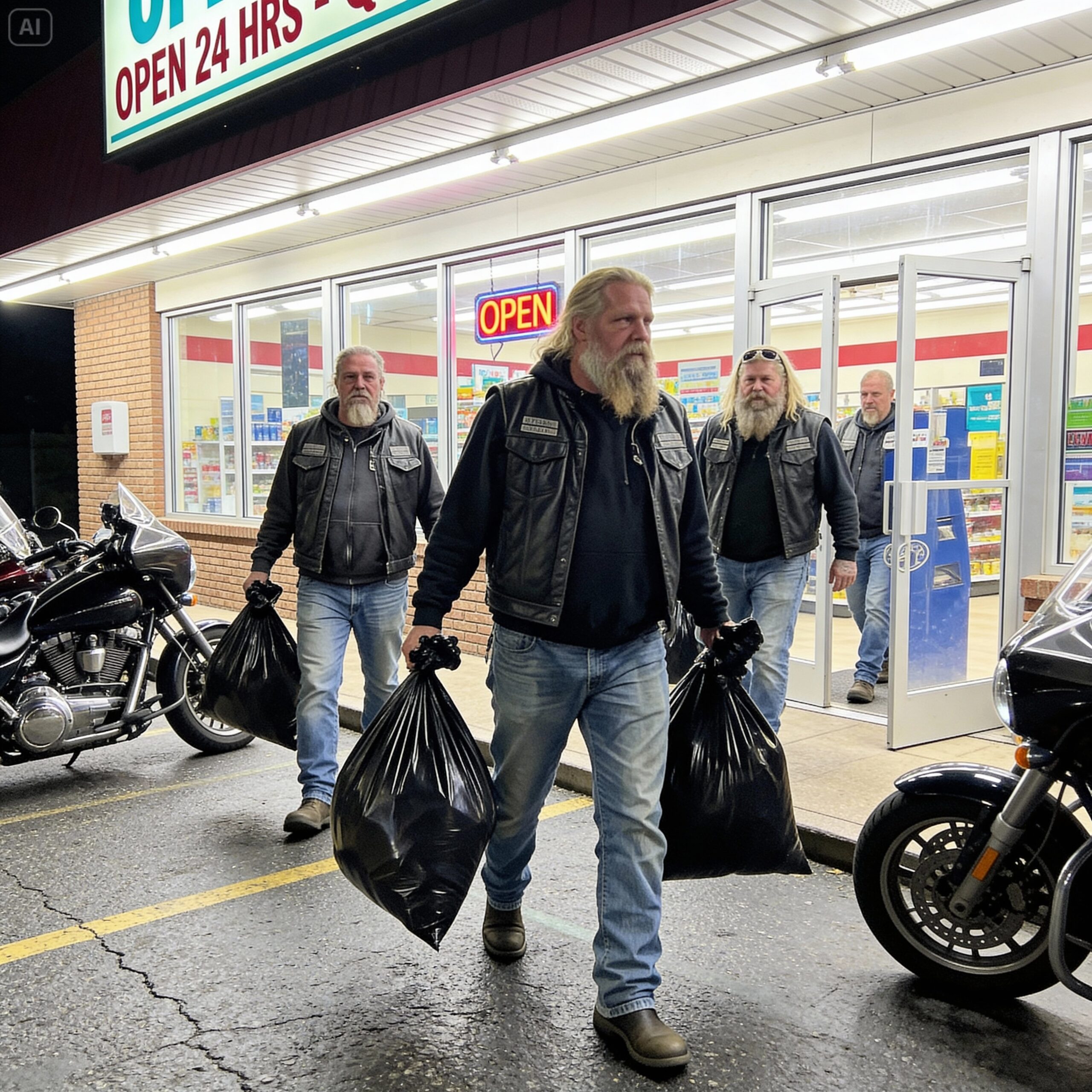 My first instinct was to slam on the gas. Mind my own business. That’s what you do when you see a motorcycle club that deep in the country, right? But then the lights inside the store caught my eye. Through the plate glass window, I saw them. Massive men in leather cuts walking up and down the aisles, sweeping everything into black garbage bags.