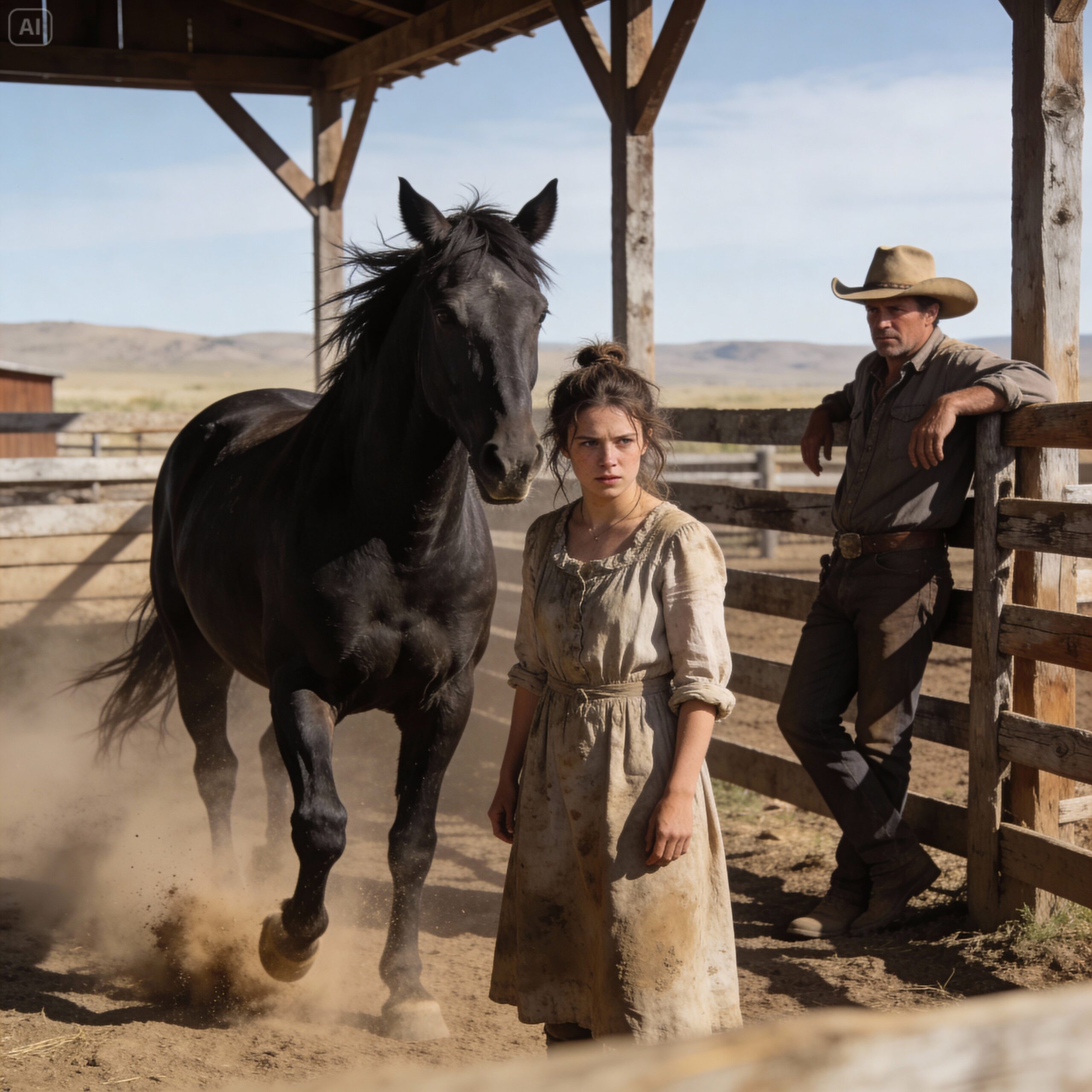 I stood at the edge of the corral, clutching a small, battered suitcase that didn’t belong to me. The dust of the Montana plains coated my throat, but it was the fear that made it hard to swallow. Inside the fence stood Brimstone.