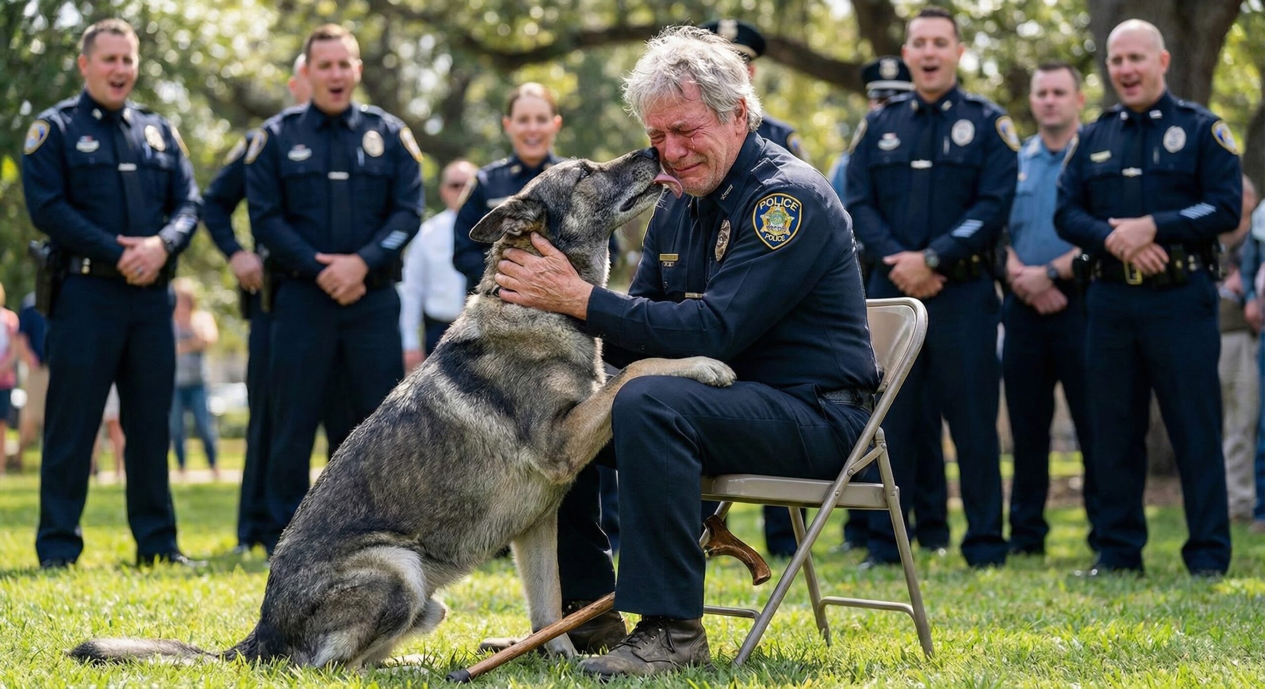 He looked older now. His muzzle was gray, and his eyes—those intense, intelligent amber eyes—looked tired. He was ten years old. A legend in the department. Today was his retirement ceremony.