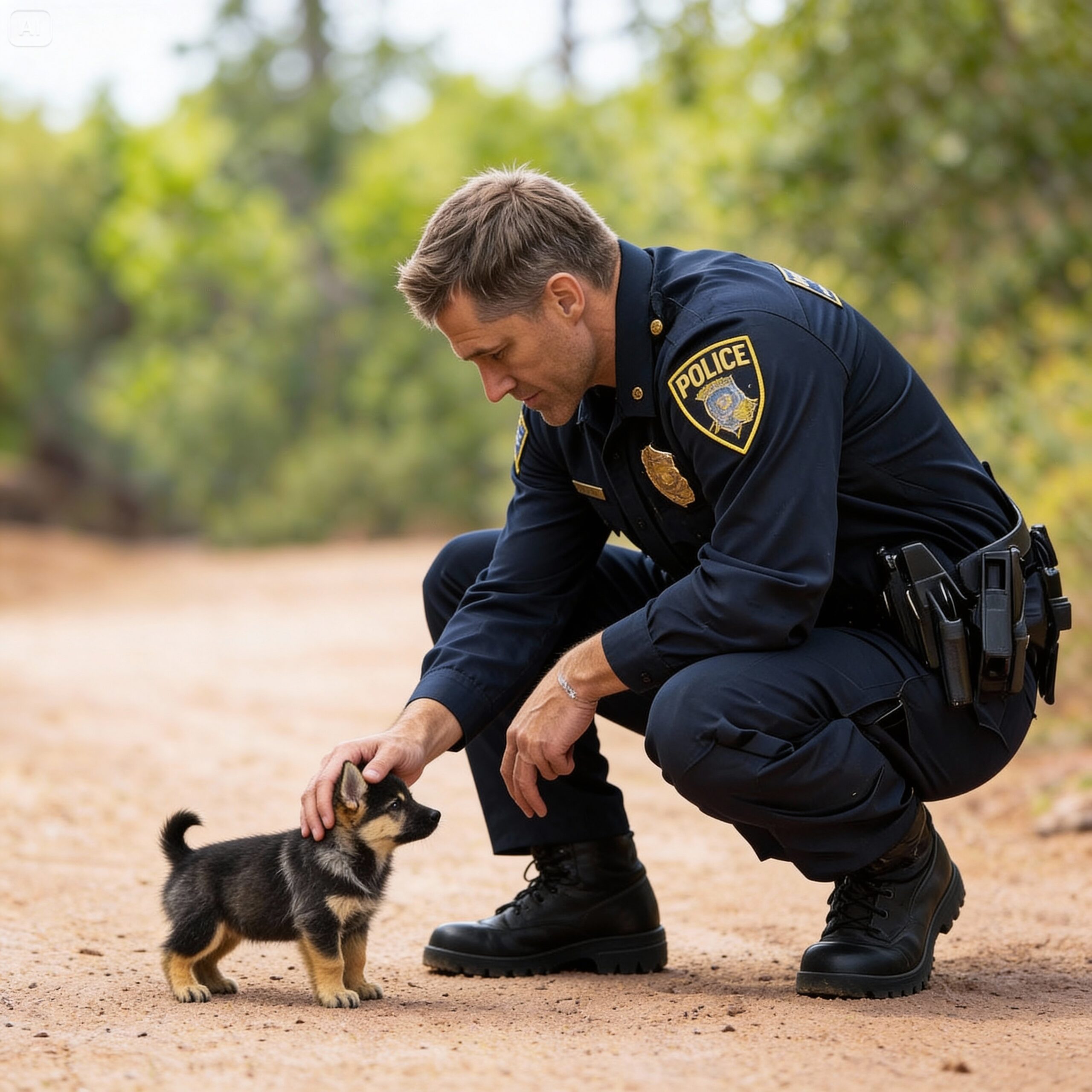 I hand-checked my holster, spinning around, expecting a hiker or maybe a stray coyote. Instead, I saw a pair of oversized ears poking out from behind a bush. A German Shepherd puppy, no more than ten weeks old, stepped into the light. He was filthy, his fur matted with burrs, but his eyes… they weren’t the eyes of a lost pet. They were hauntingly determined.