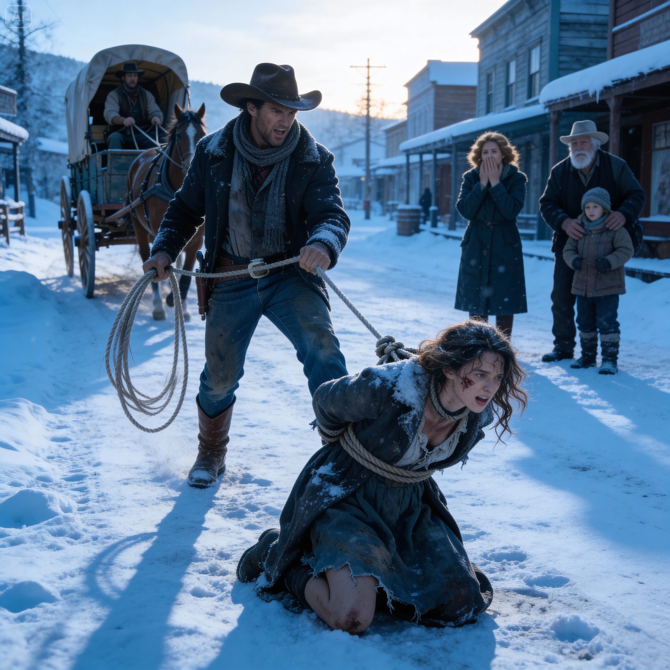 “Step aside,” my father commanded, standing up on the wagon seat and brandishing the leather whip. “This is town business. Family business. This girl is a thief and a runaway, and she’s being brought to the Sheriff for a public reckoning. You interfere with the law in this territory, and you’ll find yourself swinging from a cottonwood before sundown.”