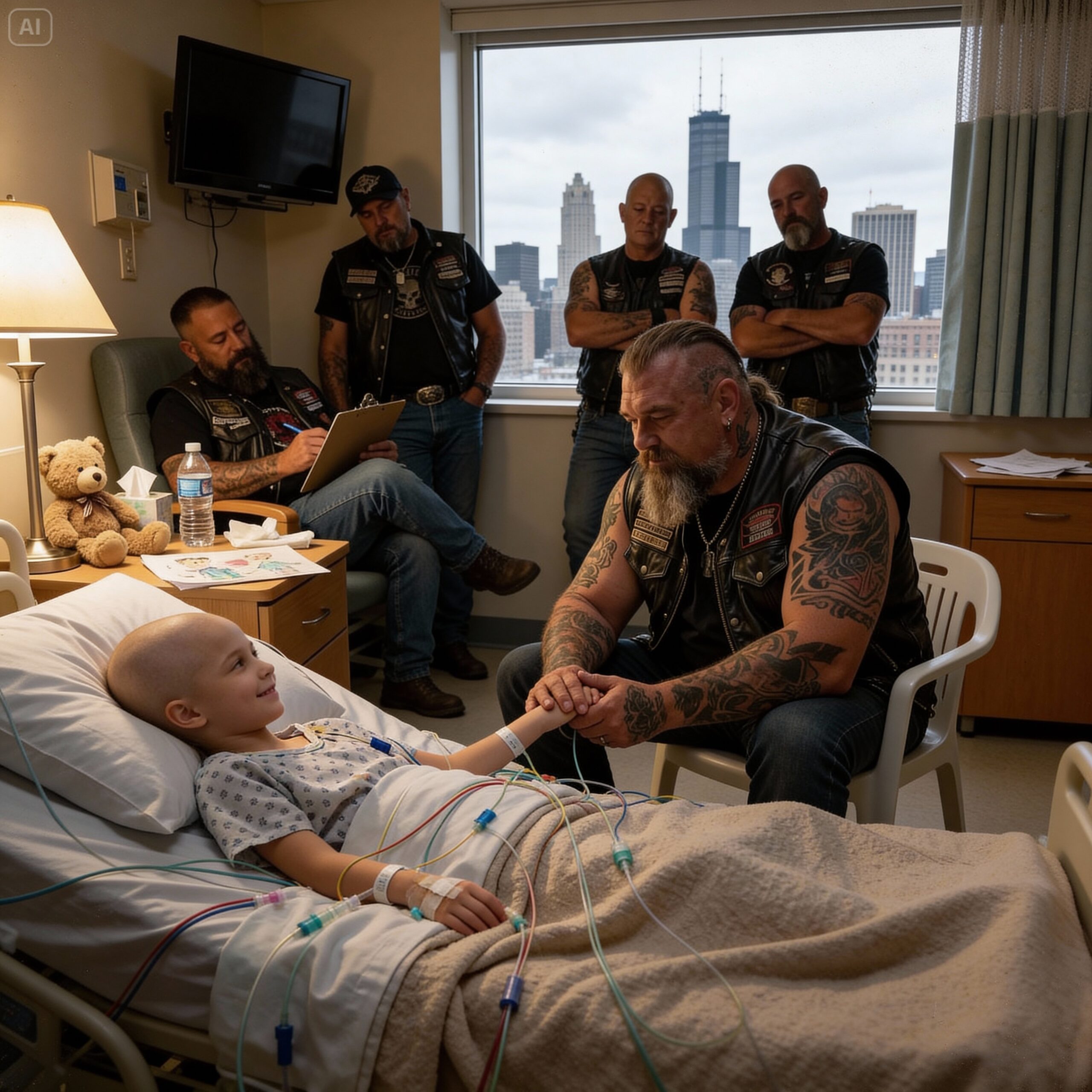 They call me Jax. I’m six-foot-four, three hundred pounds of bearded, tattooed muscle, and I ride with a club that most folks cross the street to avoid. I don’t scare easy. I’ve seen brawls, I’ve seen crashes, and I’ve buried more brothers than I care to count. But nothing—absolutely nothing—prepared me for the Tuesday afternoon I took a wrong turn at St. Luke’s Hospice in Chicago.