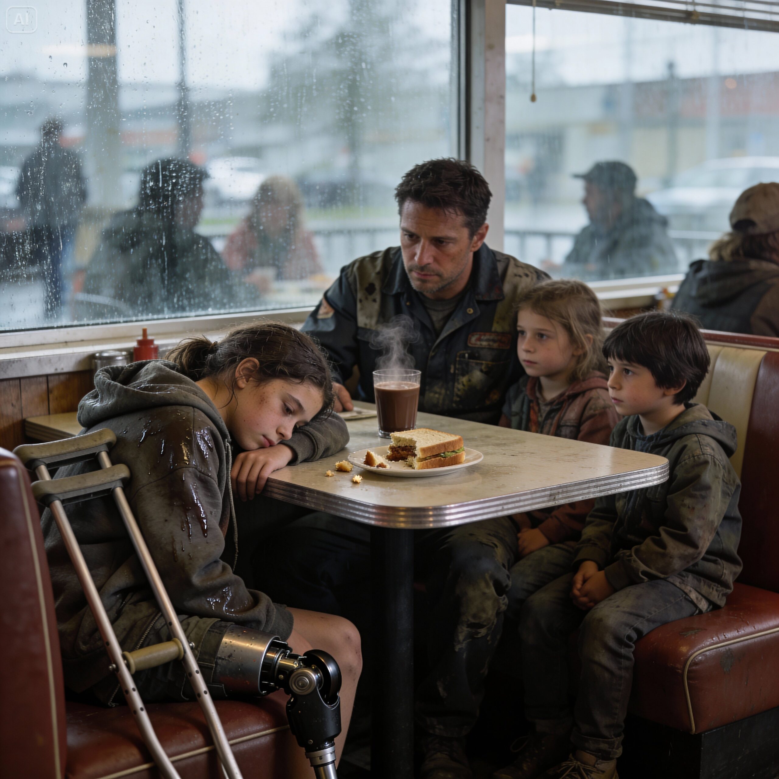 I shifted my weight on the cracked vinyl of the booth, feeling the springs dig into my lower back. I looked at her—really looked at her. Her knuckles were white as they gripped the handles of her crutches, the metal vibrating slightly from the strain of holding her upright. Her left pant leg was soaked, the fabric dark and heavy, clinging to the prosthetic limb underneath. It wasn’t just that she was wet; she looked eroded, like a stone worn down by a river that never stopped flowing.
