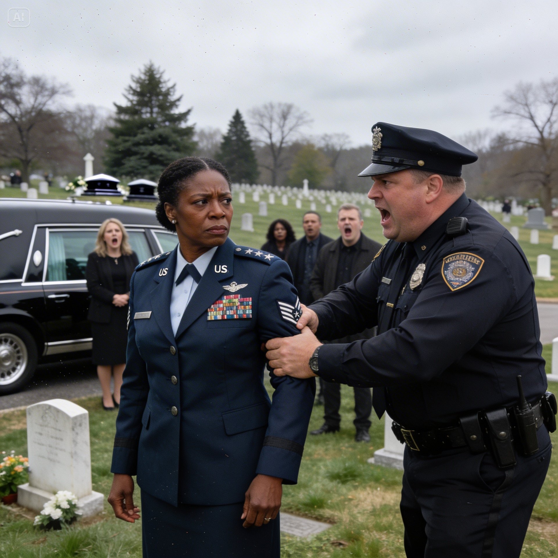 Before I could process the sheer audacity, he grabbed my arm. A jolt of fire shot up my shoulder as he twisted it behind my back, slamming my body against the hot metal of his cruiser. The weight of my service medals dug into my chest. The metallic click of the handcuffs echoed like a gunshot. The cold metal bit into my wrists. In front of my family, in front of my mother’s flag-draped casket, I wasn’t a general. I was just another body he thought he could break.