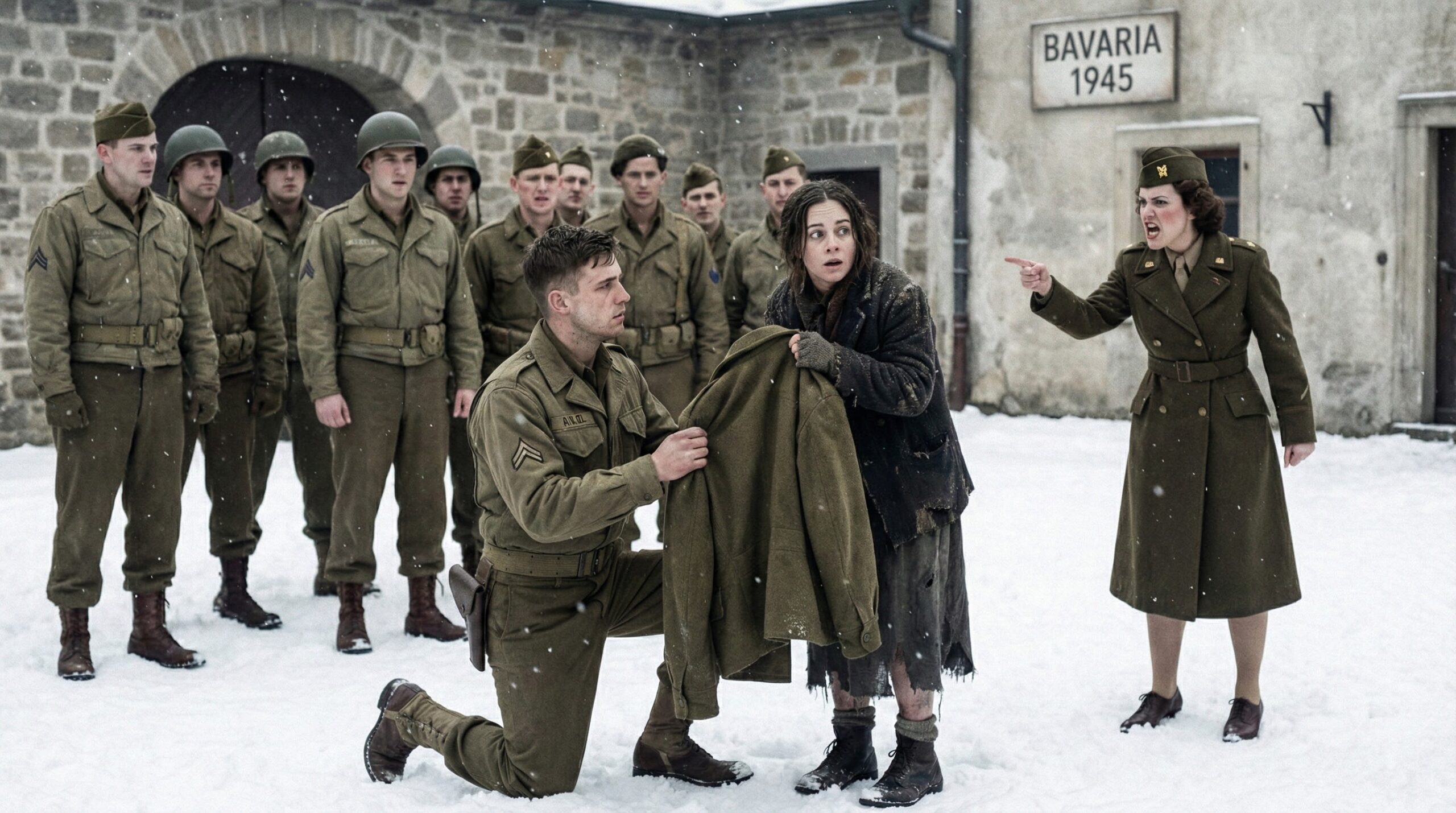 Slowly, deliberately, I unbuttoned my field jacket. My fingers were numb, clumsy in the cold, but I forced them to work. The heavy wool, the canvas—it was the only shield I had against the Bavarian winter. As I peeled it off, the cold hit me like a physical blow. It punched through my flannel shirt, sinking its teeth into my ribs. It was a shock, a reminder of just how vulnerable these women were.