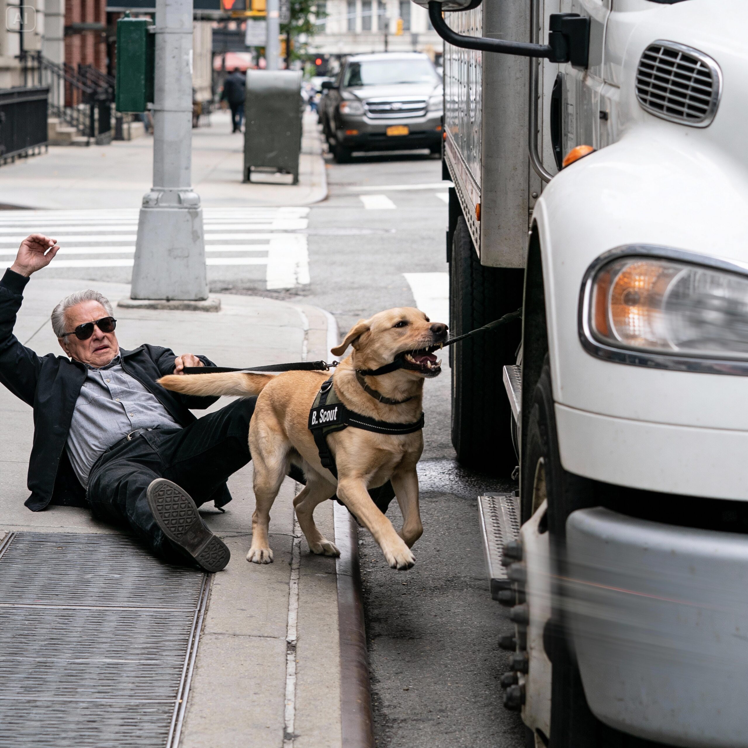 That’s when Scout broke protocol. He didn’t just block me; he lunged sideways, body-checking my legs with full force. I lost my footing. I stumbled back, flailing, hitting the cold concrete of the sidewalk hard.