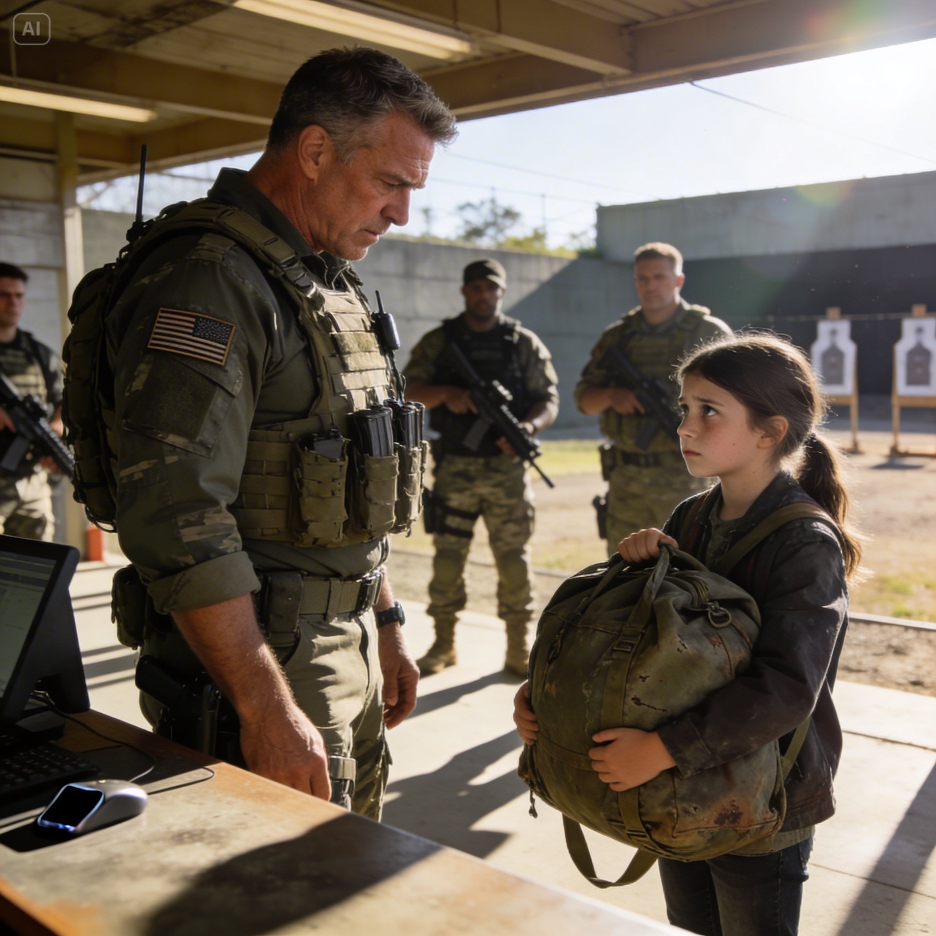 Twelve years old, maybe, with eyes that held the kind of quiet grief you see in old photographs. She was clutching a duffel bag that seemed to weigh more than she did, standing at the check-in desk of a firing range reserved for the most elite warfighters on the planet.