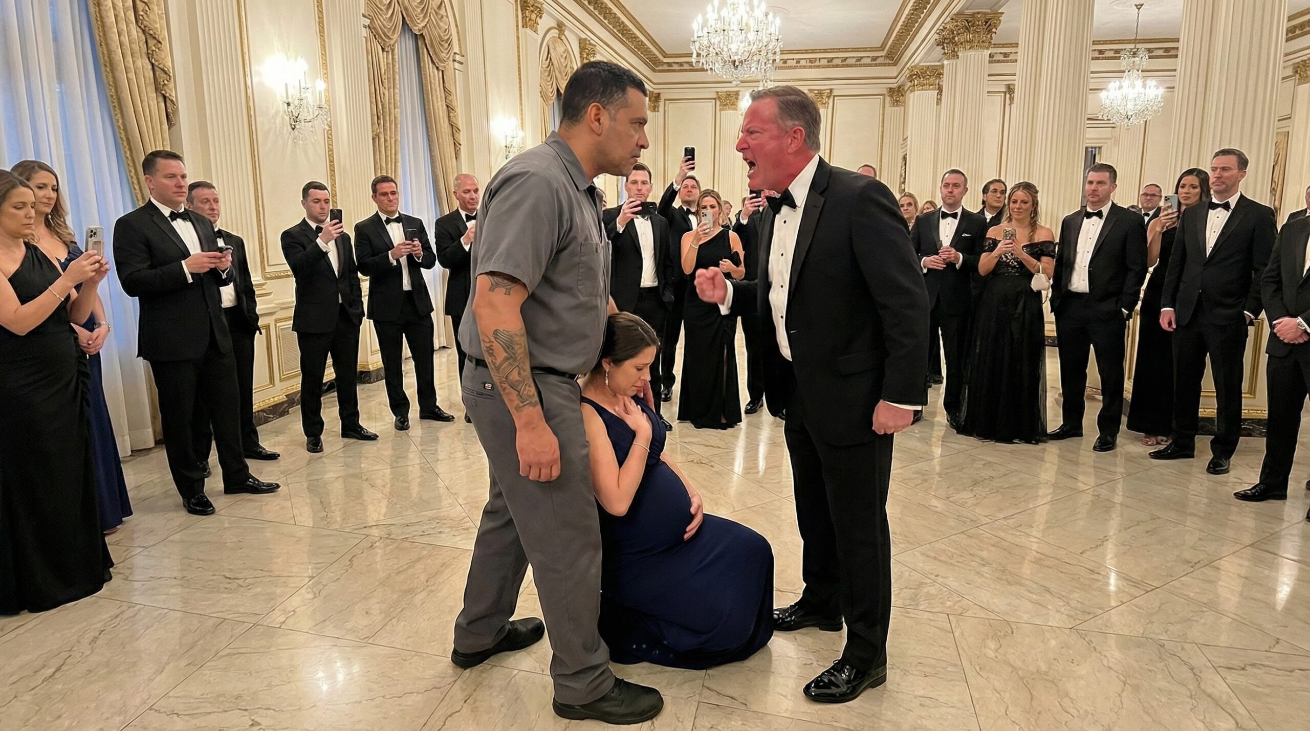 The voice came from the ballroom entrance. Four NYPD officers were pushing through the crowd of tuxedoes and ballgowns. The sea of wealthy onlookers parted like the Red Sea, happy to let the blue uniforms handle the mess they were too polite to touch.