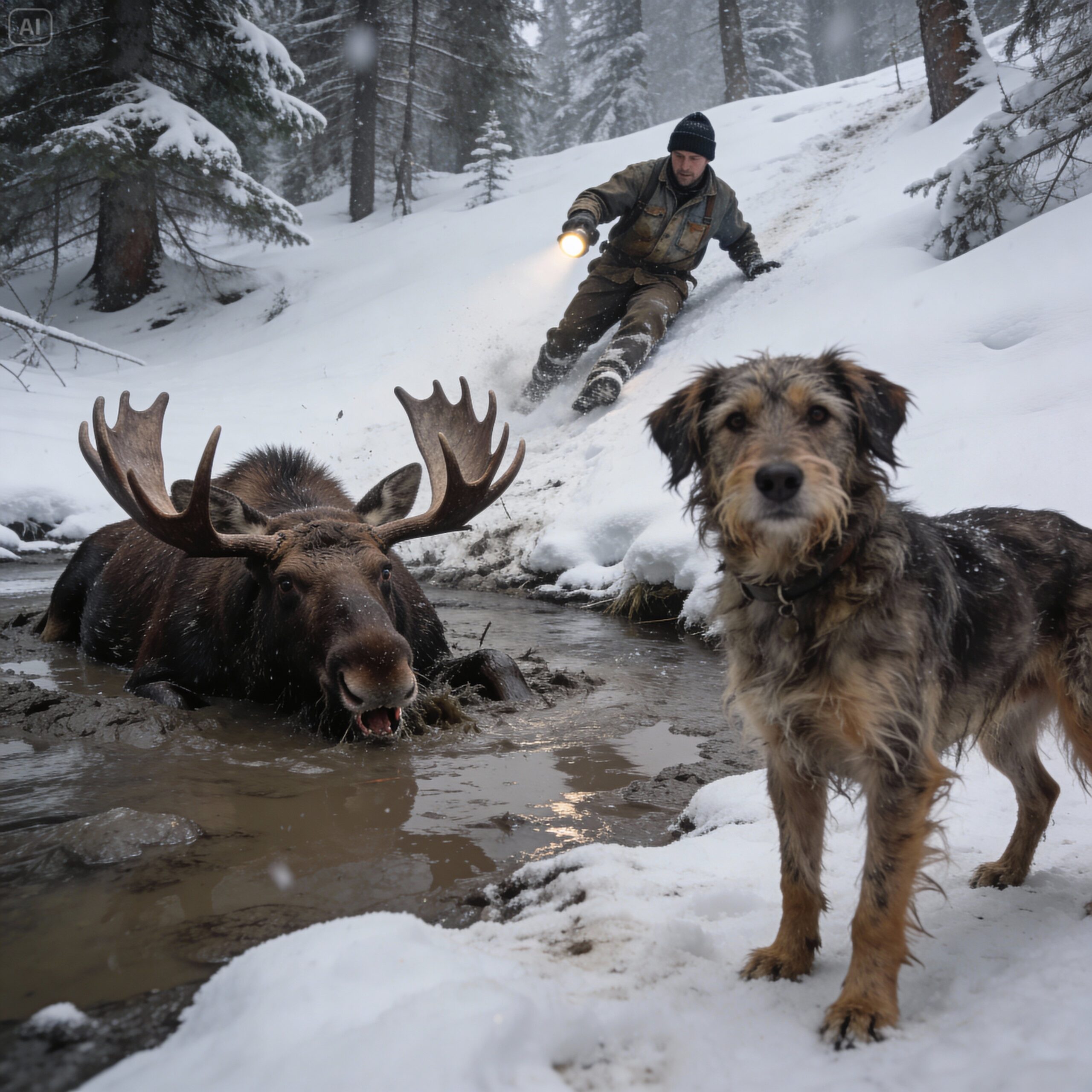 Duke was standing at the edge of a frozen creek bed. The ice had shattered, creating a thick, muddy slurry. And trapped in the center, buried up to its neck in freezing sludge, was a massive Bull Moose.