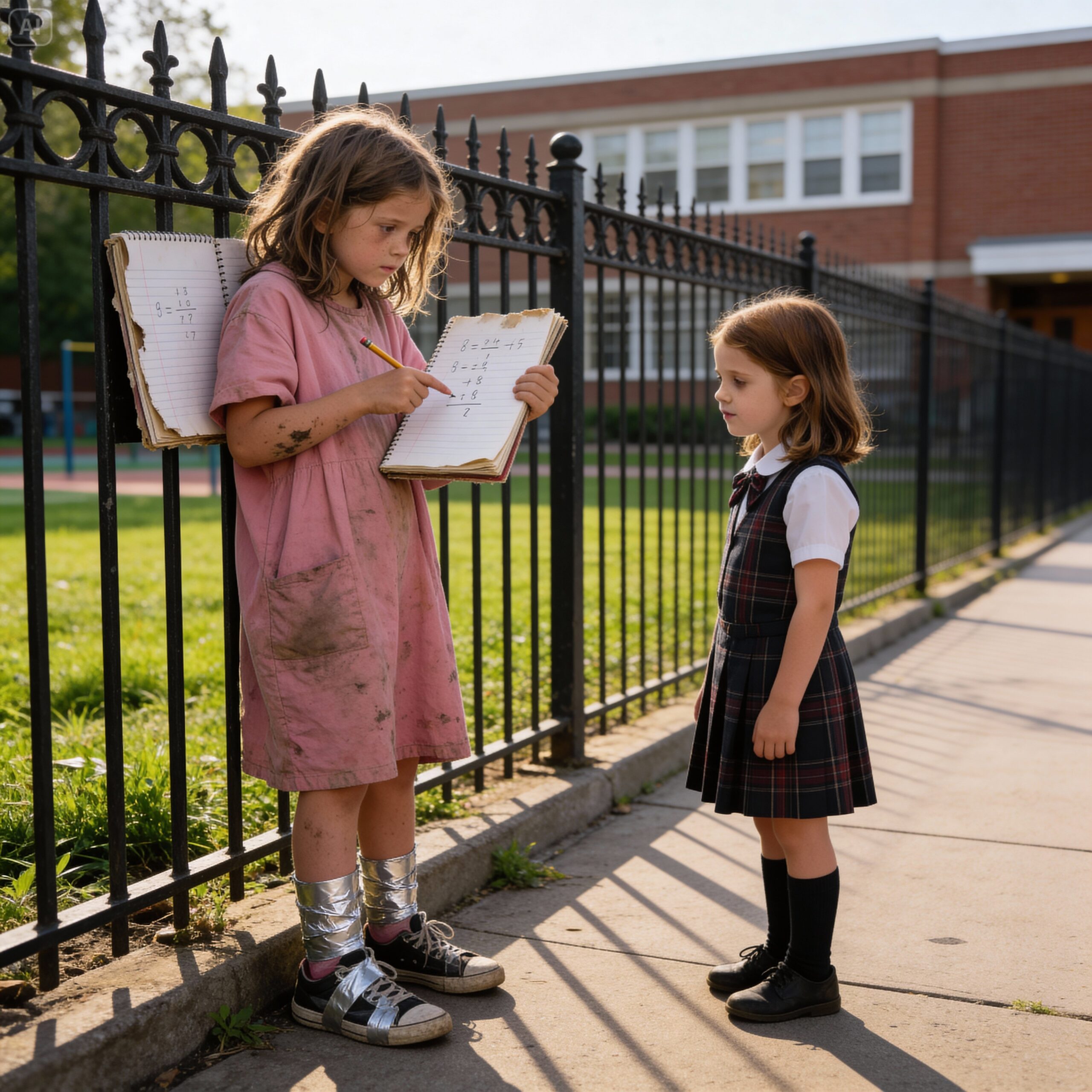 I stood frozen behind the hedge. This child, homeless and hungry, was tutoring my billionaire daughter through a fence.