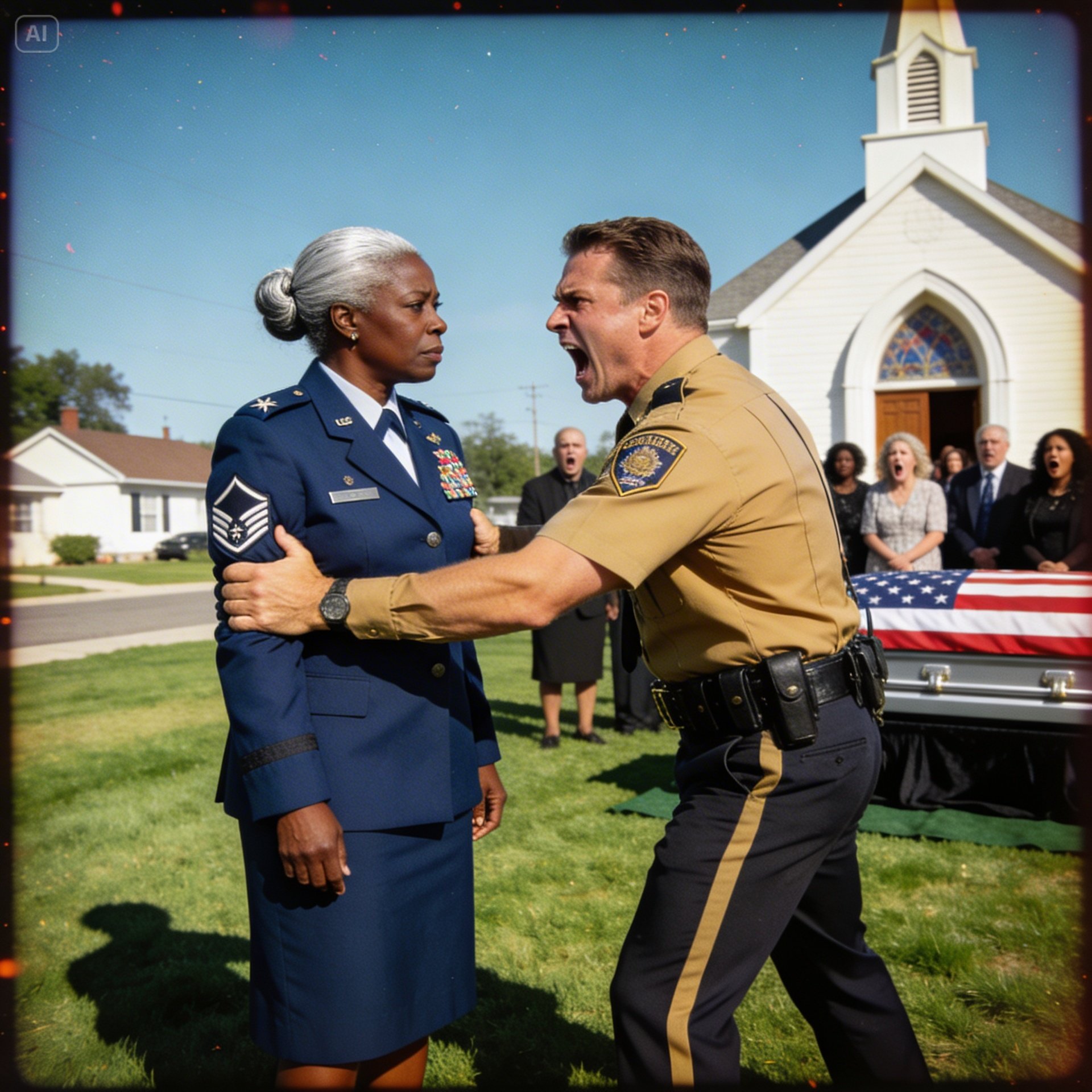 As the hearse prepared to lead us from the chapel, the wail of a siren ripped through the quiet grief. A local police cruiser screeched to a halt, blocking the way. An officer, Clint Vance, climbed out. His mirrored sunglasses hid his eyes, but his contempt was plain to see. He scanned the crowd of mourners, his gaze sliding right over my uniform, the ribbons, the stars. He didn’t see a commander. He saw a Black woman in a town he believed he owned.
