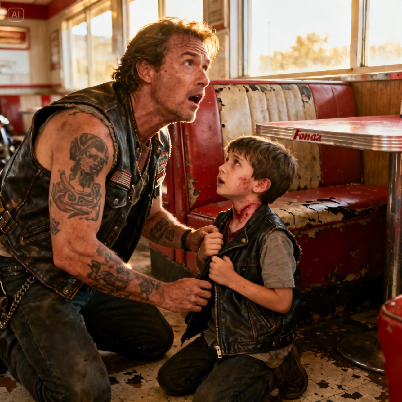 For a long, stretched-out second, the universe consisted only of the humming of the ancient Coca-Cola fridge, the frantic pounding in my own ears, and the face of this child, eyes squeezed shut as if waiting for the blow he’d just requested. The man I had been my entire life—Caleb “Ironjaw” Mercer, a man who solved problems with his fists, his reputation, or the roar of an engine—was gone. In his place was just a hollowed-out shell, kneeling on a dirty diner floor, my entire world view shattered by a boy who weighed less than my leather jacket.