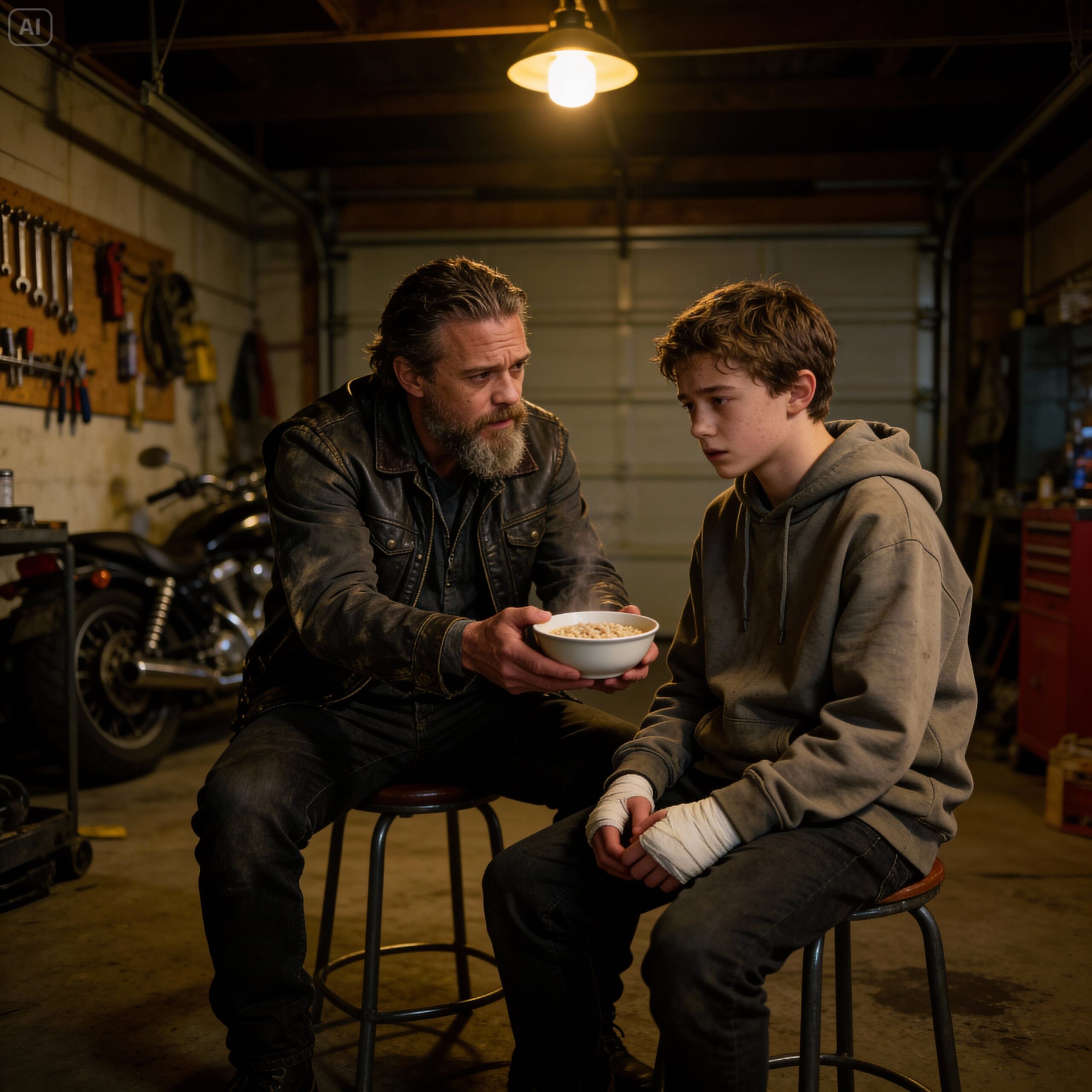 The Biker walks in. He looks the same—leather jacket, heavy boots, eyes that scan the room before he enters fully. He spots me. He doesn’t smile, but his shoulders drop an inch.