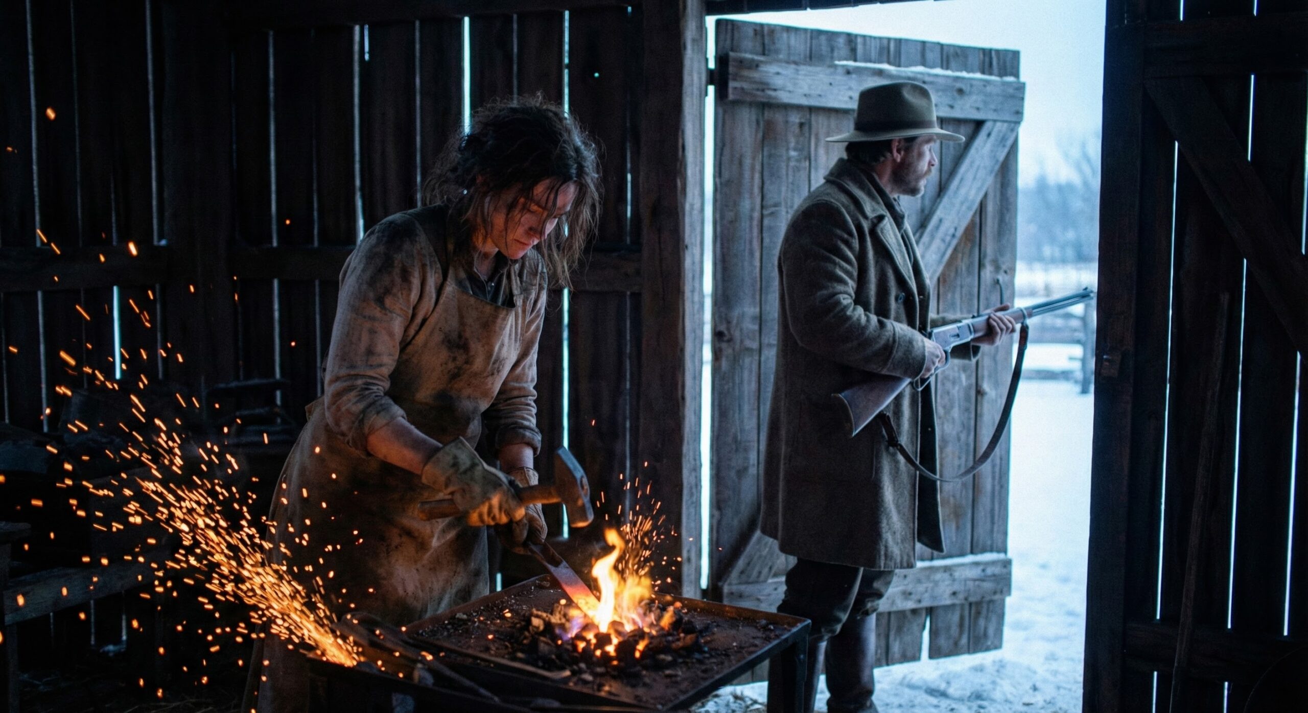 Grace stood in the doorway of the barn. She wasn’t hiding. She was standing tall, holding a heavy iron pry bar she had forged herself. She looked small against the vast white landscape, but she stood like a queen.