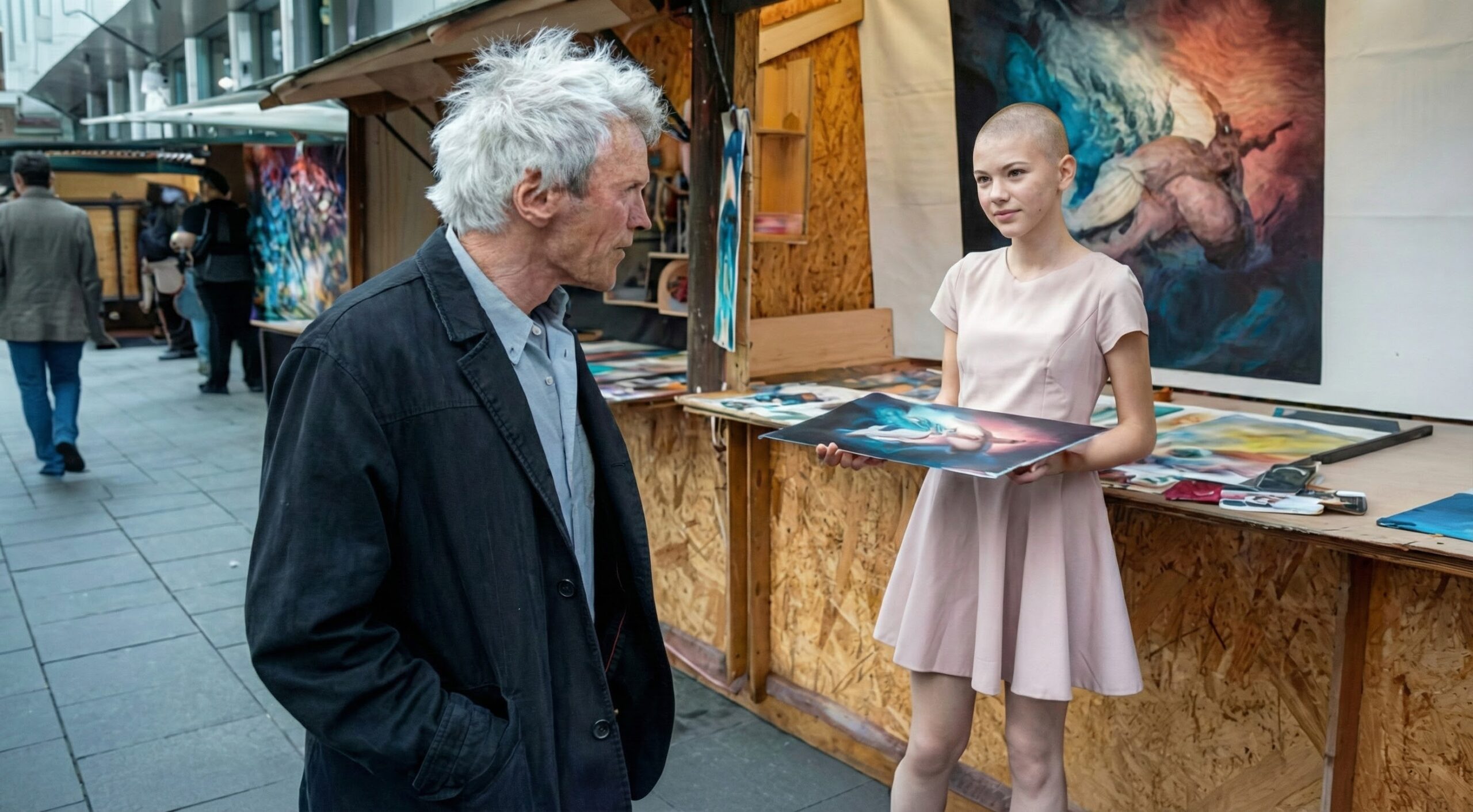 I was packing up my brushes, my hands trembling from exhaustion, when the atmosphere shifted. It wasn’t a noise; it was a quietness. A tall figure had stopped right in front of my table.