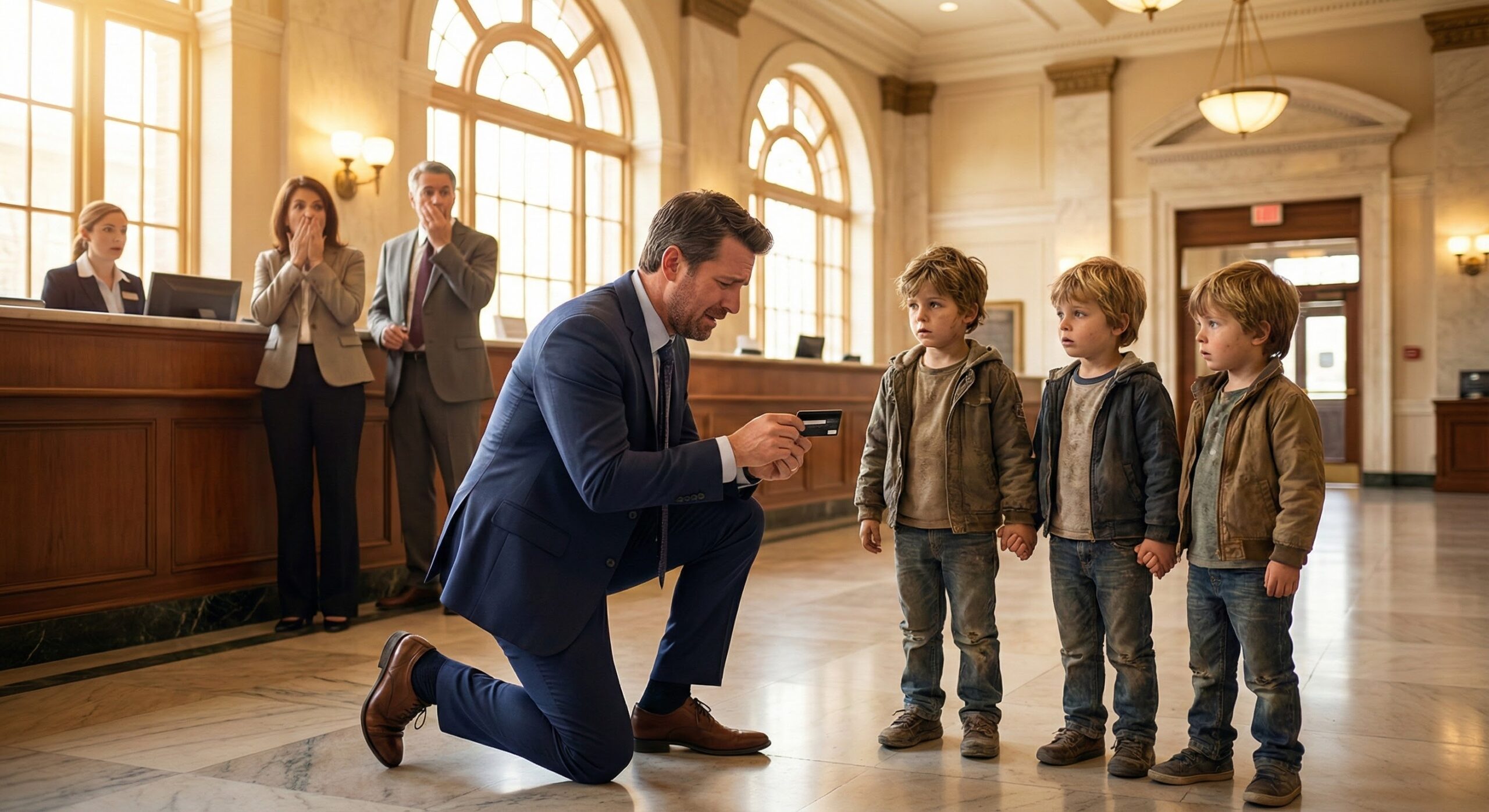 I was still on my knees on the cold marble of the lobby floor. My suit trousers, tailored in Milan, were absorbing the chill of the stone, but I couldn’t feel it. I could only feel the weight of the black plastic card in my hand and the gaze of three pairs of hazel eyes staring at me.