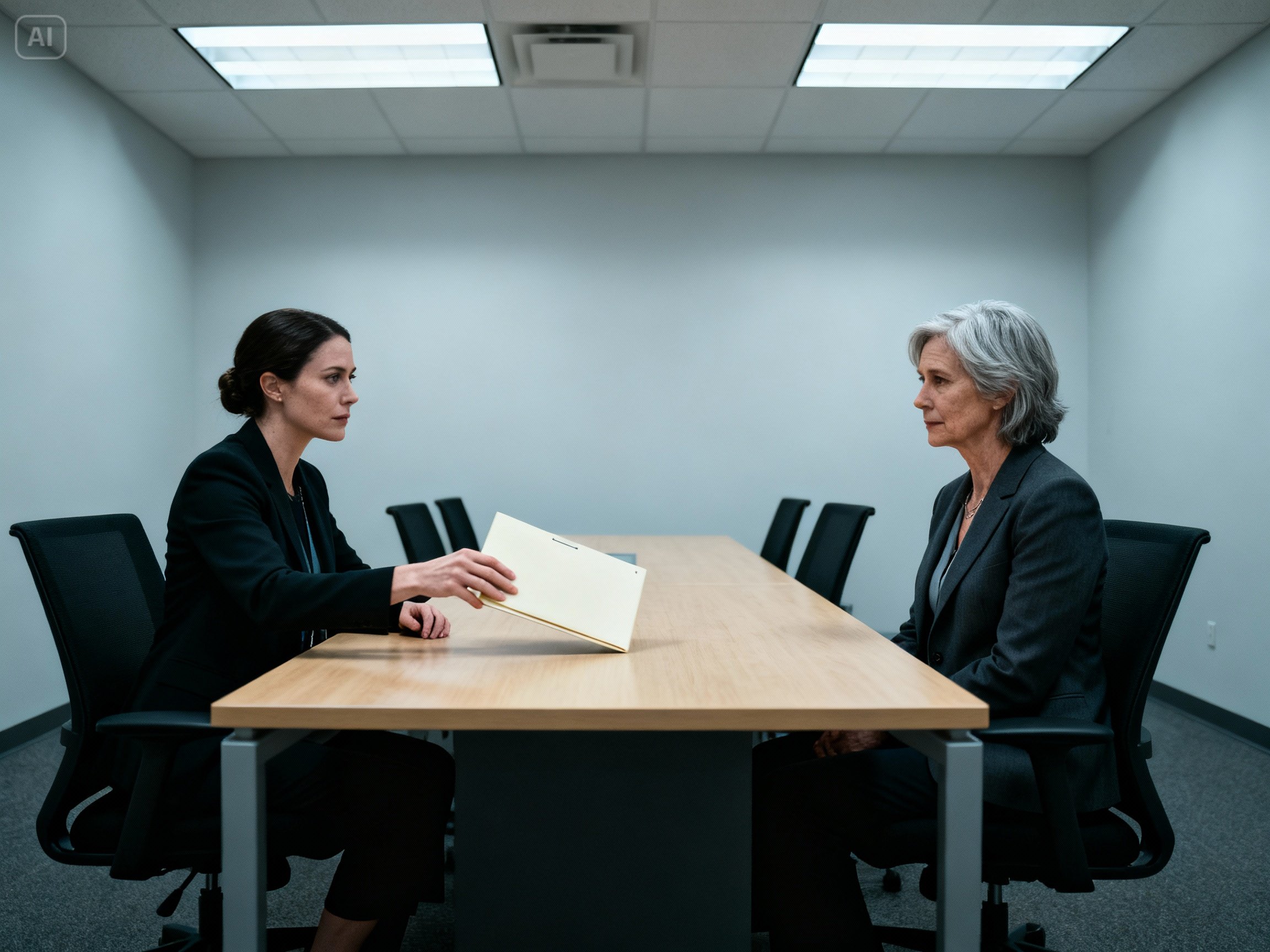Next to her was Monica Reynolds, a newer addition to the HR team. Monica looked nervous. She was shifting in her seat, arranging and rearranging a stack of folders. One of those folders—cream-colored, thick cardstock—was sitting isolated in front of the empty chair. My chair.