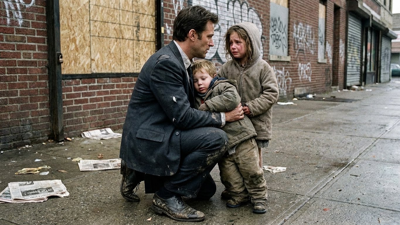 A little girl, no older than seven, with tangled chestnut hair and a dirt-stained pink dress. She was kneeling on the freezing concrete, cradling a boy who looked about five. Her arms, thin as pencils, were wrapped around him as if her love alone could tether him to this earth.