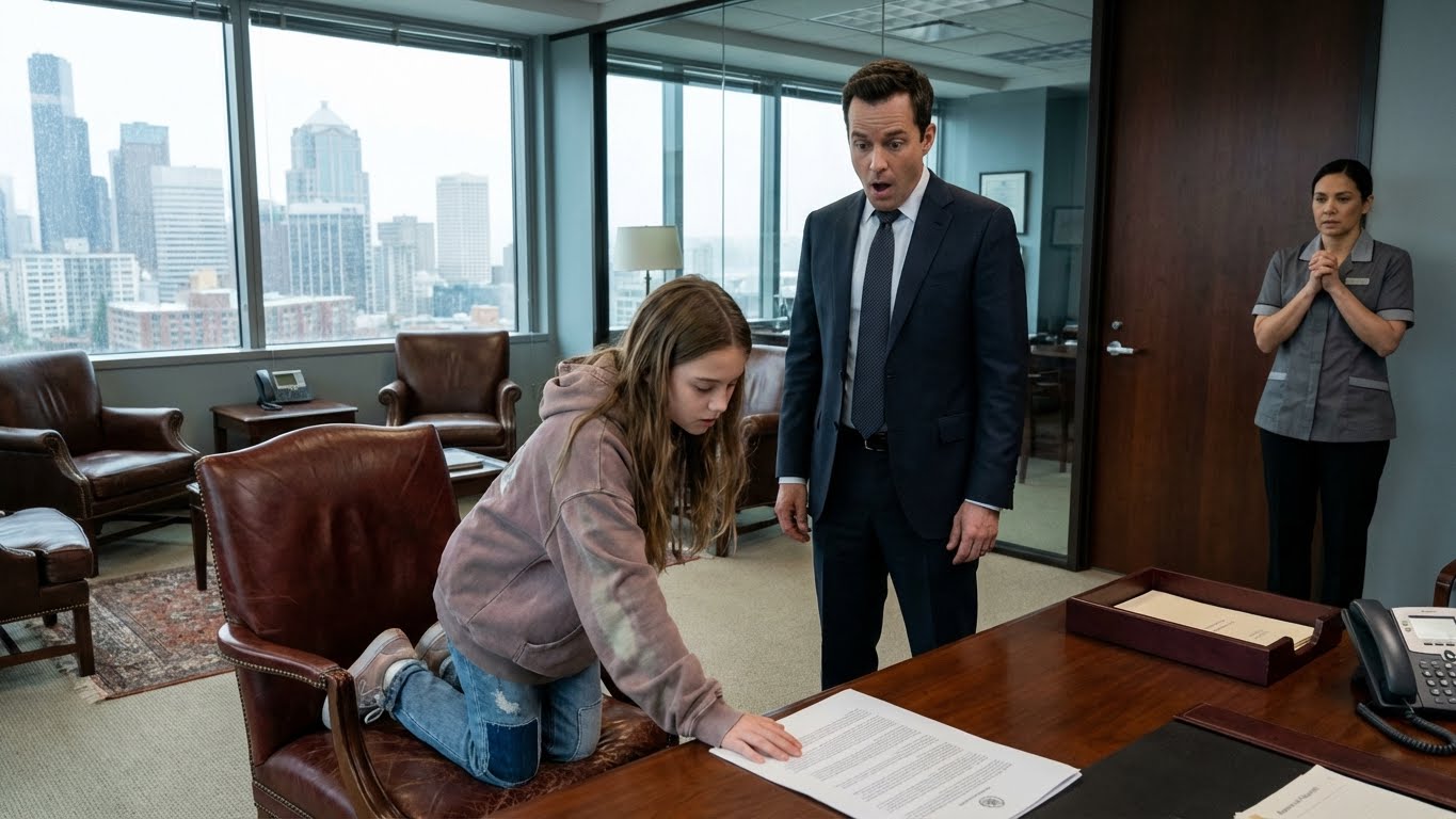The silence in the corner office of Whitmore Technologies was heavy, the kind of silence that follows a lightning strike. Marcus Whitmore sat behind his desk, the fraudulent contract spread out before him like a dissected cadaver. Across from him, Maria Chen sat on the edge of the plush leather guest chair, her hands clasped so tightly in her lap that her knuckles were white. Between them, oblivious to the seismic shift that had just occurred in the adult world, seven-year-old Isabella sat on the Persian rug, reading a copy of The Wall Street Journal with the casual interest of a child reading a comic book.