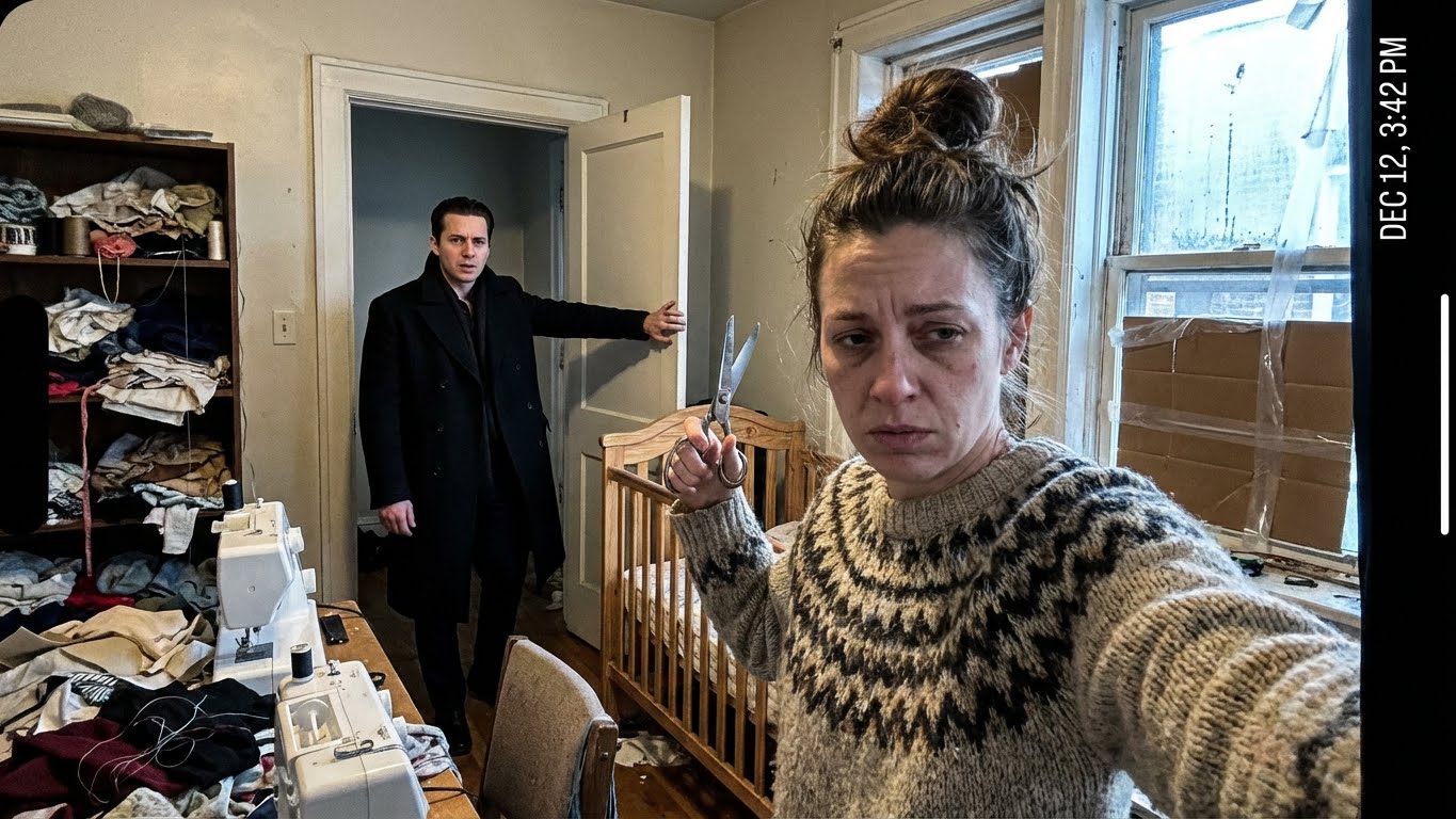 Her chair scraped lightly against the floorboards as she stood, stepping instinctively between me and the child. A pair of sewing scissors flashed in her hand—not as a threat, but as a boundary she was daring me to cross.