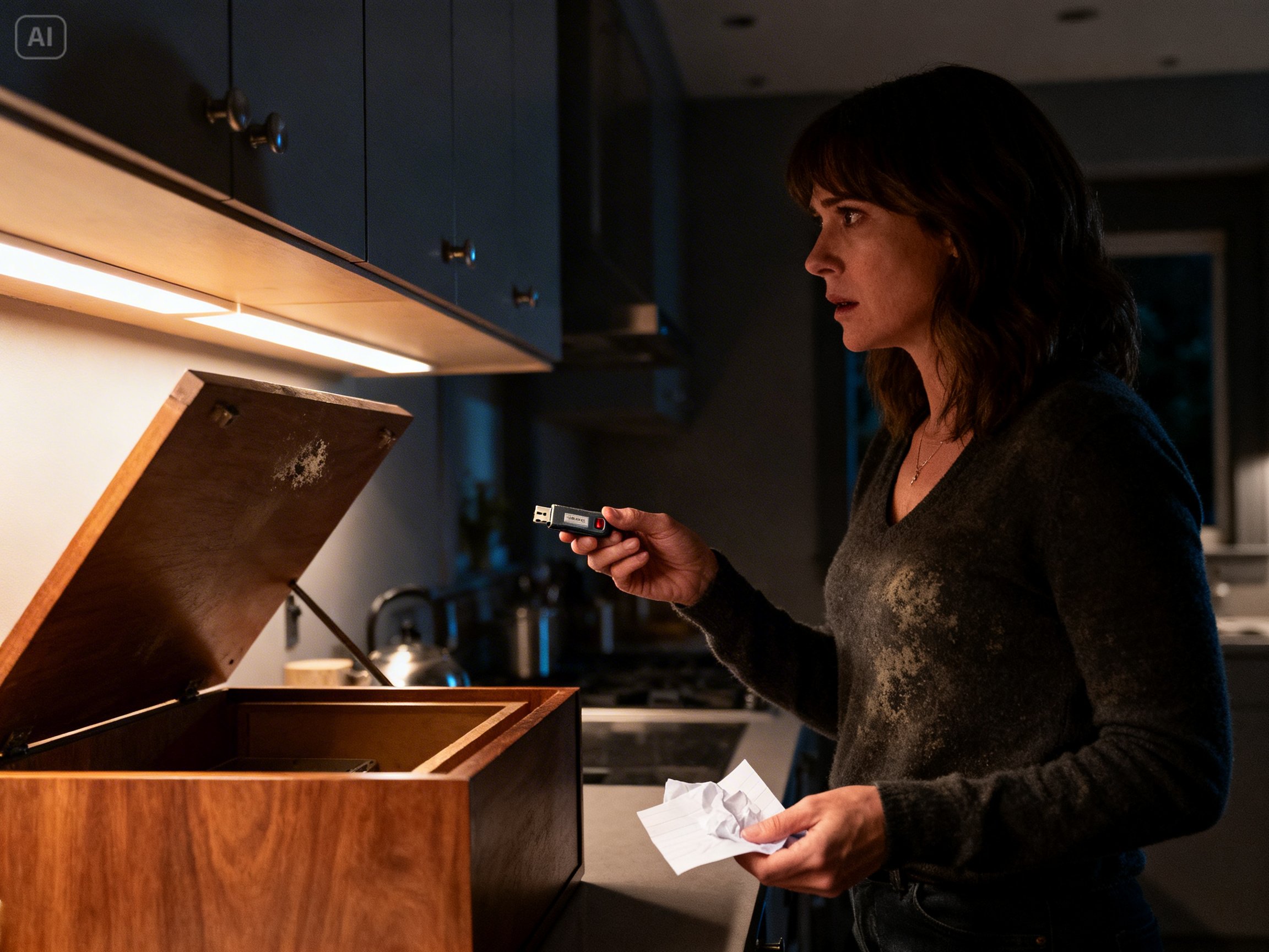 That night, when I stepped into the kitchen to get a glass of water, the silence of my Oregon home was broken by a presence I couldn’t see. There was another envelope on the table, stark white against the dark wood, with no name on it. Inside was only one typed line: Mallory, don’t sleep in that house tonight. Check the third kitchen cabinet on the left.