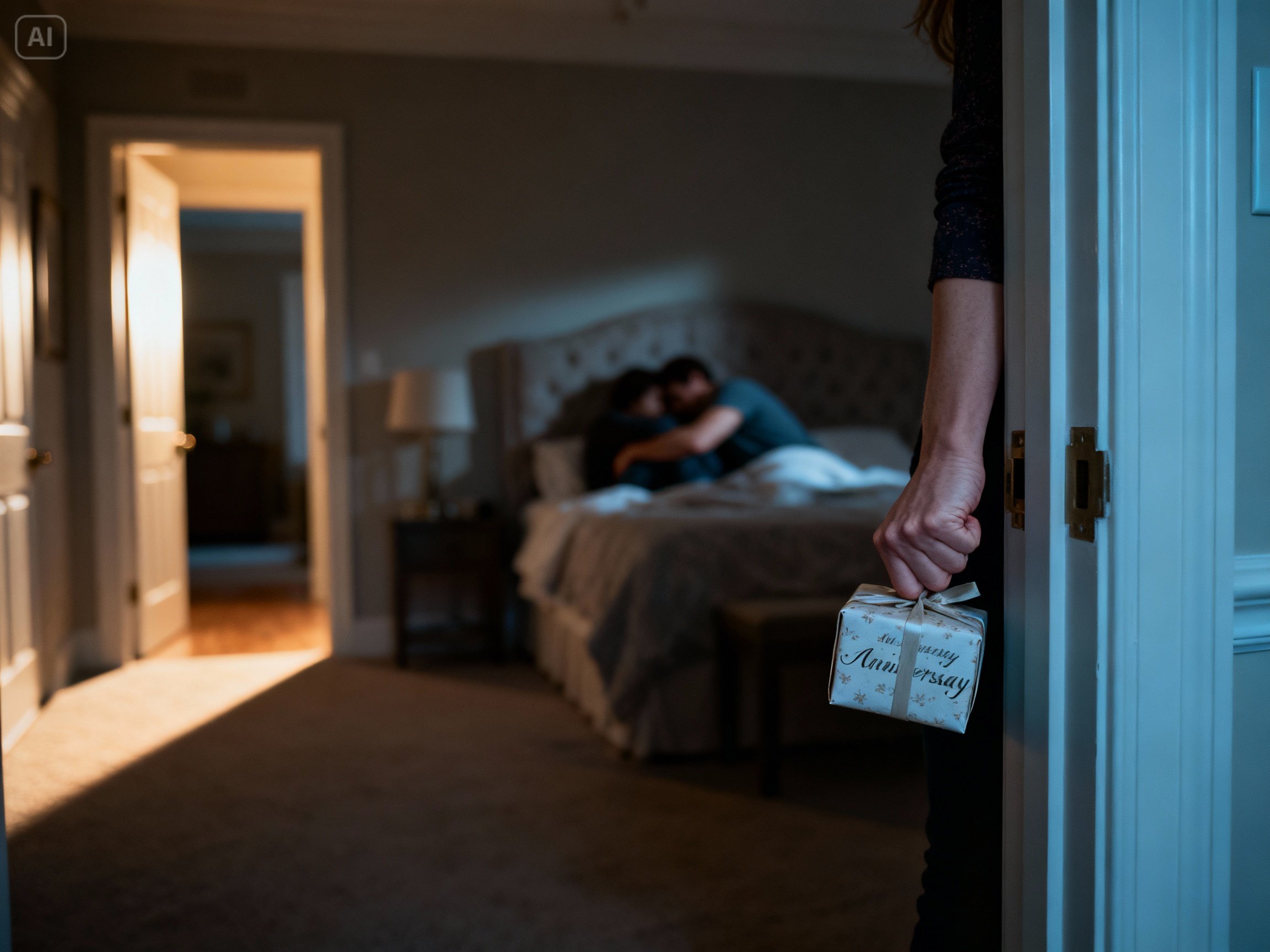I frowned, slipping off my heels so they wouldn’t click on the floor. I walked up the stairs, the plush runner absorbing my steps. The house felt heavy, like the air had been sucked out of it. As I reached the landing, the door to our bedroom was slightly ajar. Just a crack.