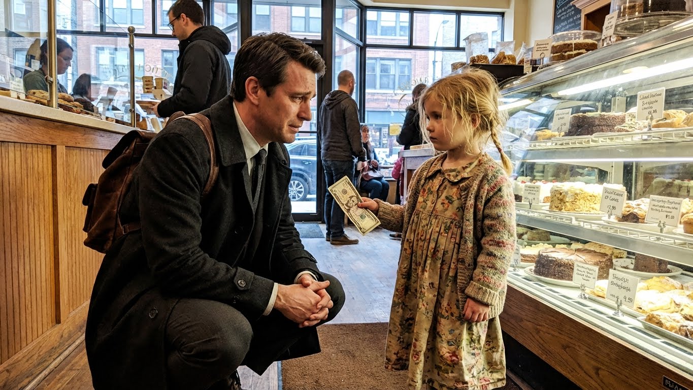 I looked down at Lily. She was ten now. Taller, missing a tooth, wearing a dress she had picked out herself. She was looking up at me with those same blue eyes that had peered over the bakery counter.